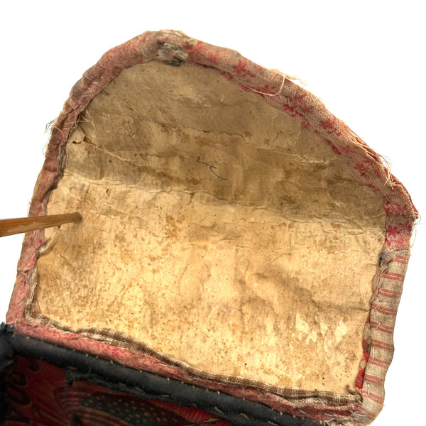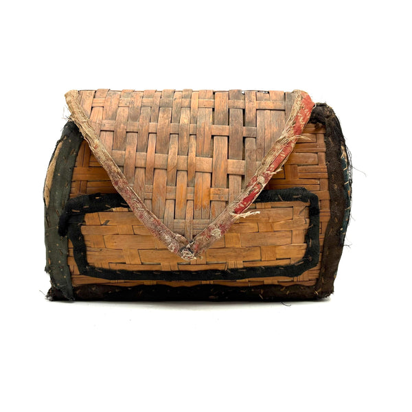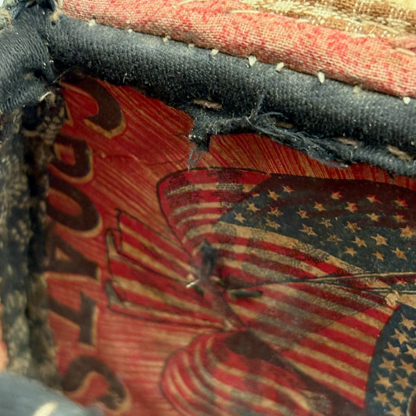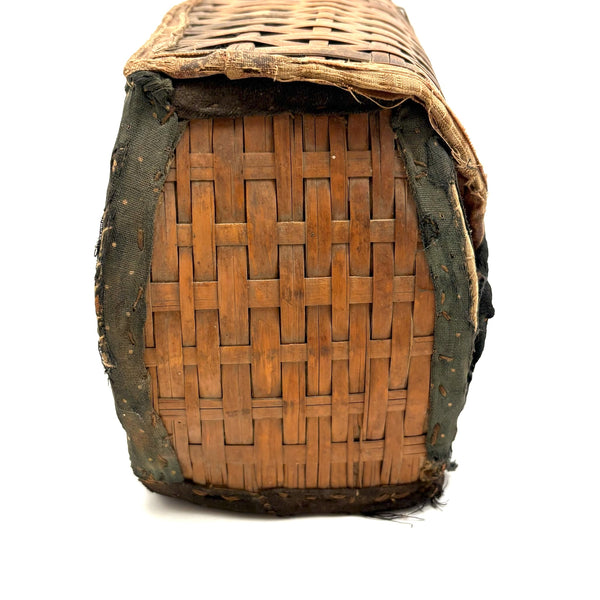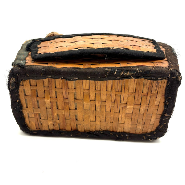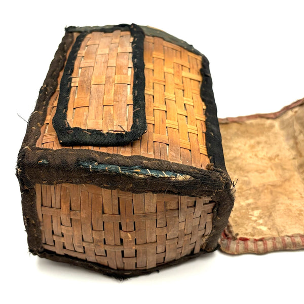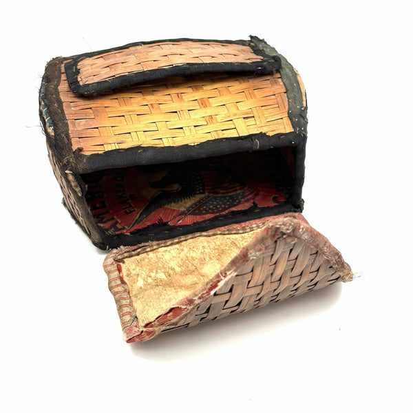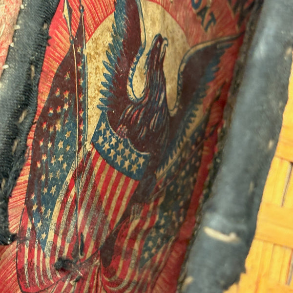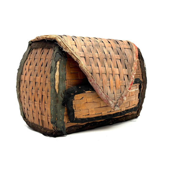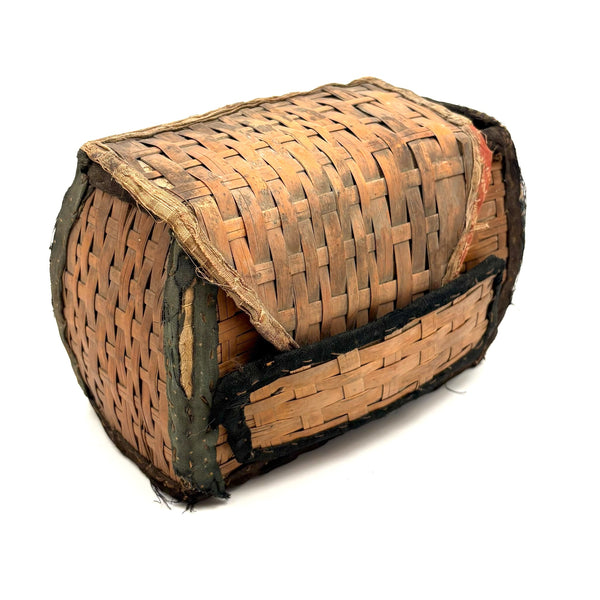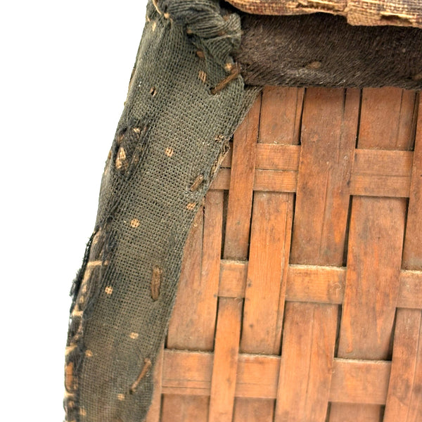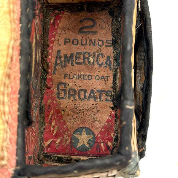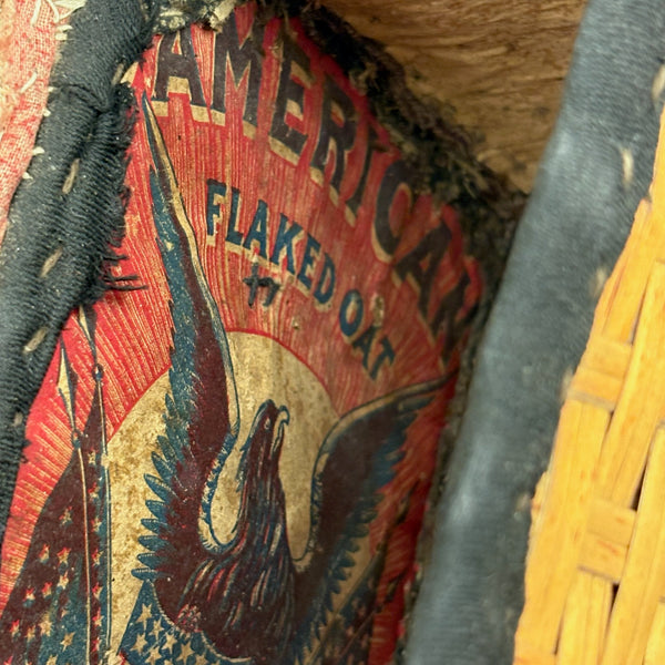 Purchased from a dealer in New Hampshire, I thought this basket was so intriguing for its combination of elements, including the use of antique red and indigo calicos for the edging, and a lining made from (a very patriotically themed) American Flaked Oat Groats sack, while hide was used to line the top flap. Once home I did an image search and turned up one very relevant reference--a photo of a very very similar basket that accompanied a "Find a Grave" record of a Samaria Emmazetta McPeak Midkiff (1874-1975), a Cherokee woman, with a note that the basket was made by Samaria as a young girl and handed down in the family. (Looking at Cherokee baskets, the style of weaving, and material--river cane I believe--is consistent, though here with this wonderful incorporation of other scrap materials making it a very hybrid thing.) I do believe mid 1880s or so, with the Groats package exactly consistent with that. Not a fancy thing, but to my sensibilities a very tender and special one, and I don't think we'll come across another like it any time soon.