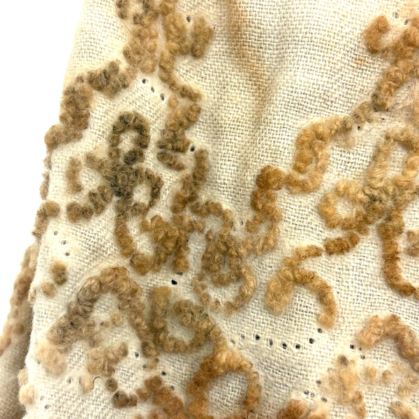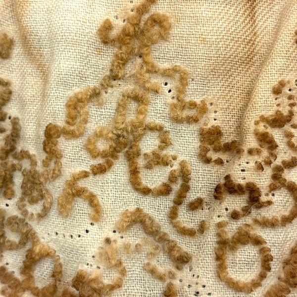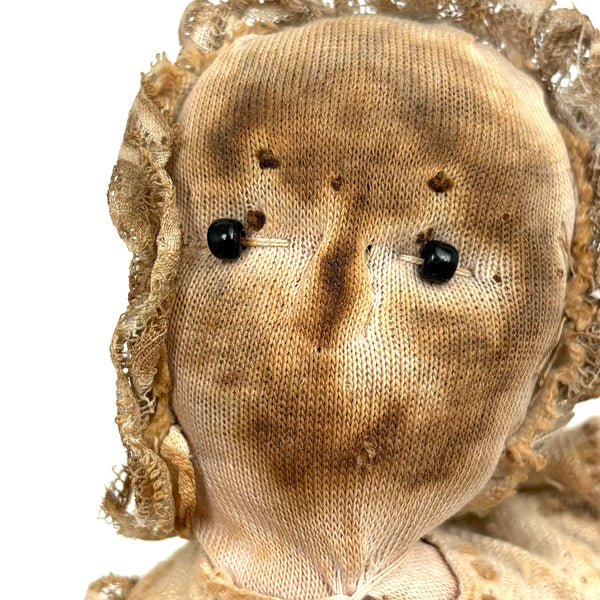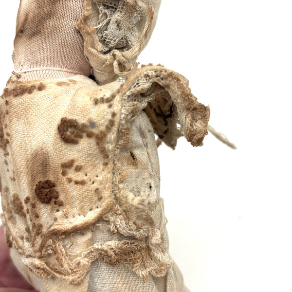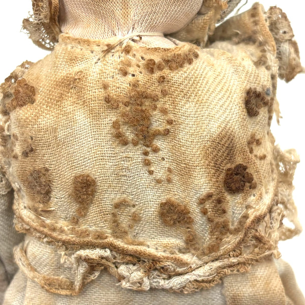 This wonderful old doll in her much aged embroidered white dress keeps making me think of Miss Havisham from Great Expectations--looking as if she's been waiting around forever for a wedding day that never arrived. How soulful she seems now, with a deep intensity to those black beaded eyes, held by thread against her knit stockingette face, white just around the eyes and toned brown nearly everywhere else. And with the woolen stump/knot-work embroidery on her dress having browned in the same way, almost as if licked by fire. This is the sort of doll I could never leave behind--completely animate seeming and Mona Lisa-esque with those eyes following one around the room! I know from the wonderful dealer I purchased her from that she is stuffed with cork, and I believe she was found in Virginia. C. late 19th century I believe.