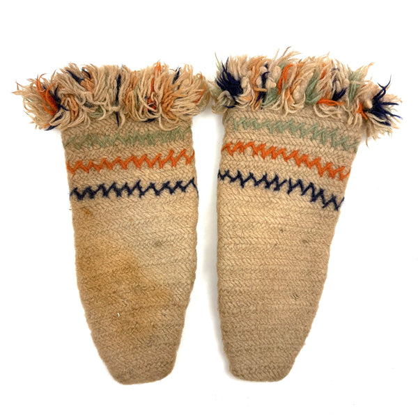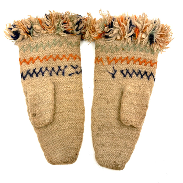 8" l. 4 1/2" across at fringe; 3 1/4" across at start of thumb. Overall good condition, with a few stains and a few lost embroidered stitches.