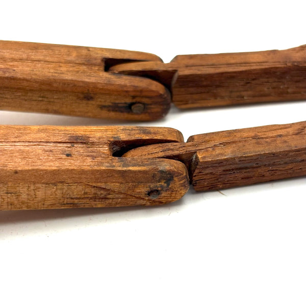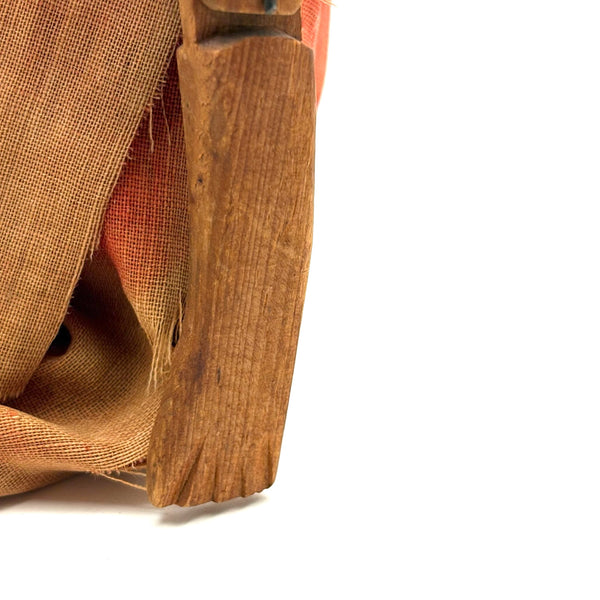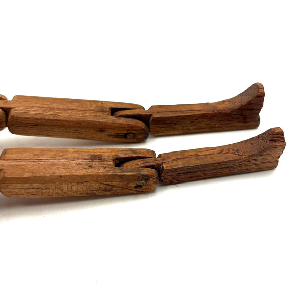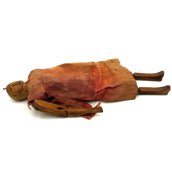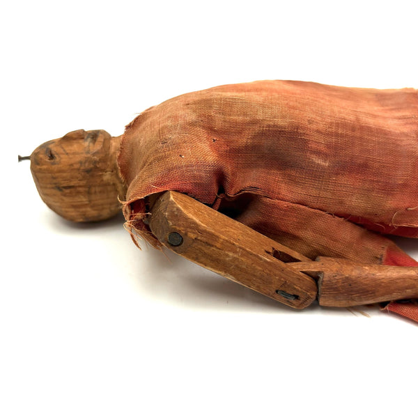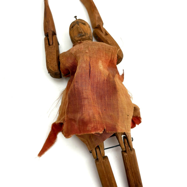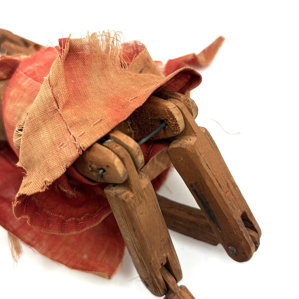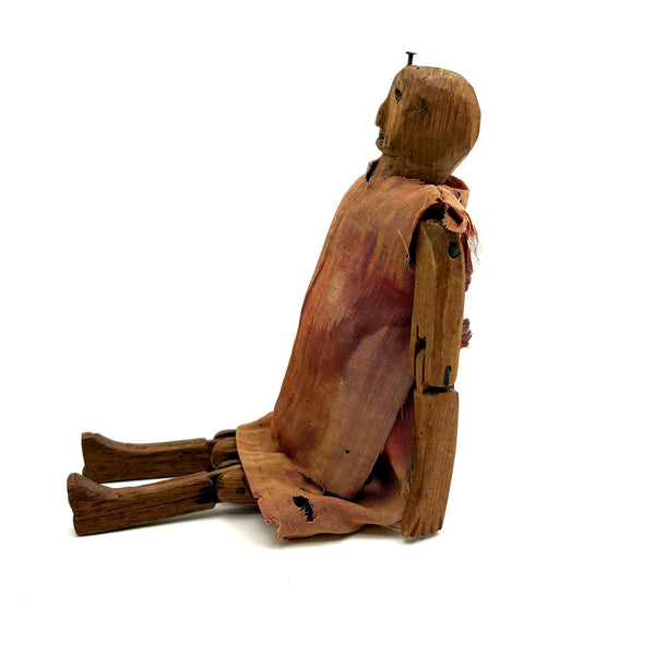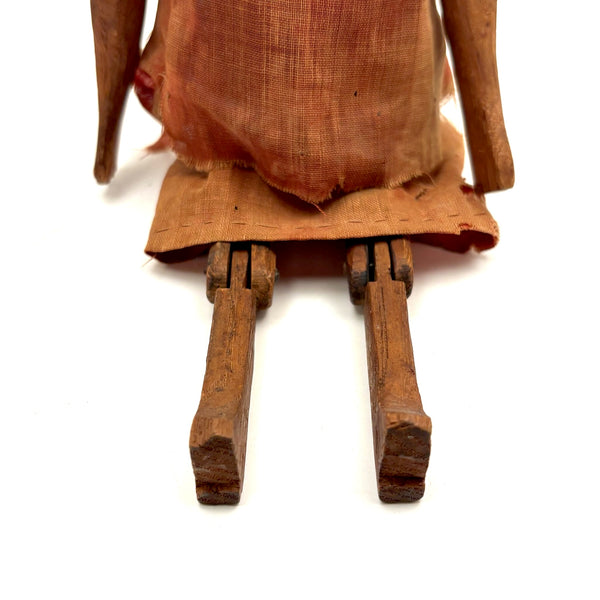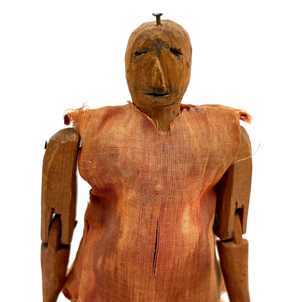 This beauty is one of a number of wonderful old carved articulated figures today, this one straight out of an amazing West Coast collection of folk/self-taught/outsider art, and my favorite of all. For me carved figures like are as close to animate as a handmade thing can be, and I always love the process of photographing them--a sort of "getting to know you" experience, through which their very individual personalities (and souls, I would say!) reveal themselves, including through discovering how they are able to bend, move, sit, etc. Here, the hand-dyed, crudely cut (but with hand-stitched hem) thin cotton outfit, faded from red to a sort of salmon pink over many years and worn to shreds in spots, enhances what I see as a wonderful sort pride and even regal-ness to her--and even if one might call that face a but homely, to me it reads as full of fortitude and resilience! I really really love her and find her to be very much alive!