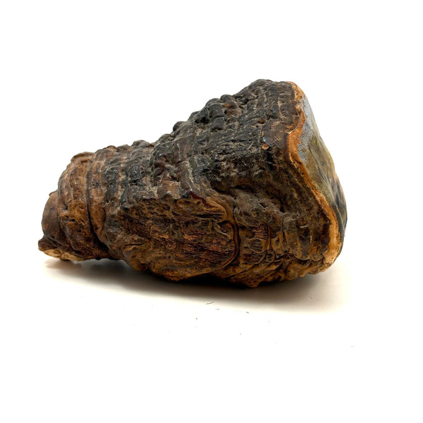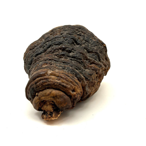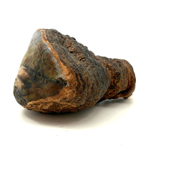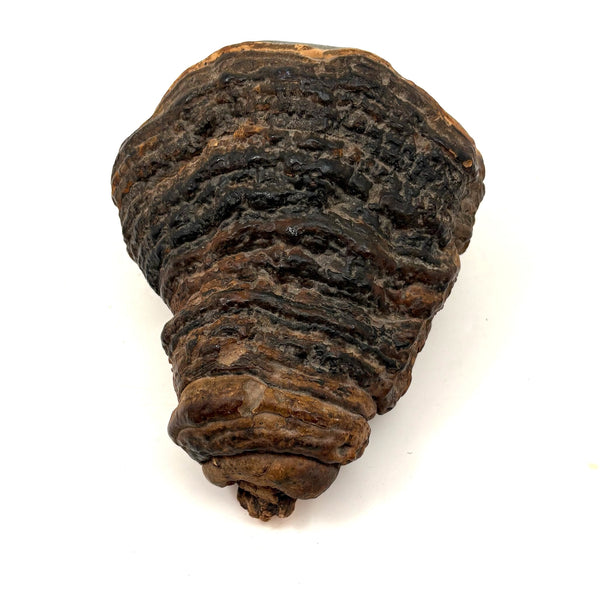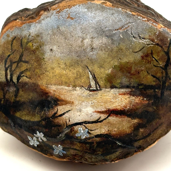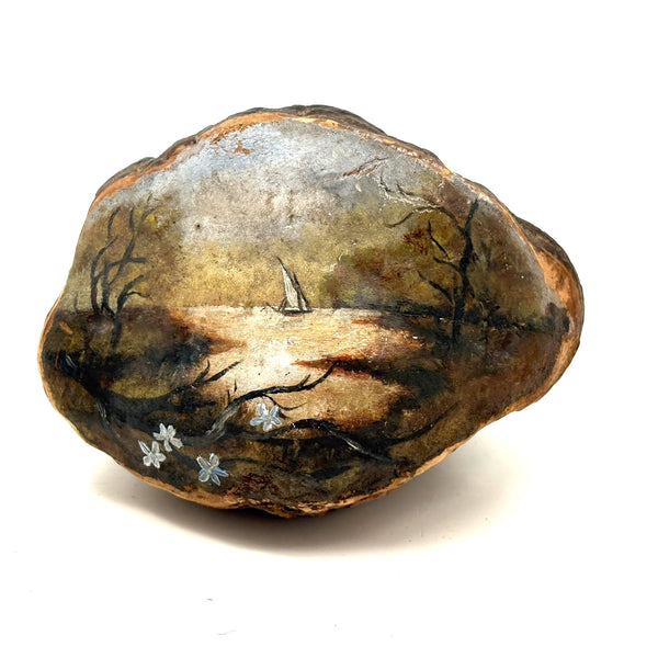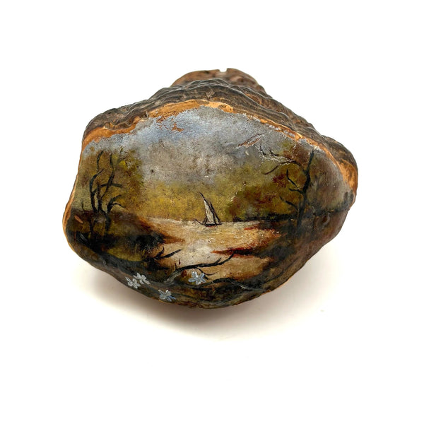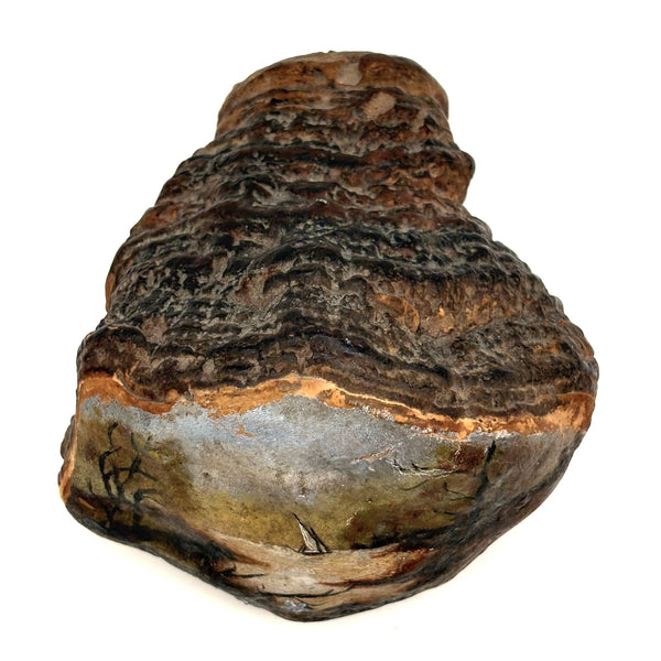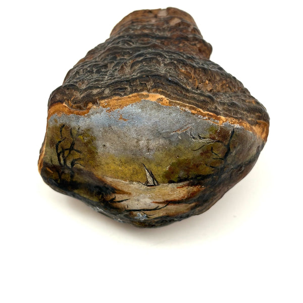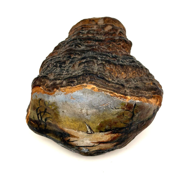 I think this is a great example of a folk art painted mushroom conk, including for the fact that this particular conk is very sculptural and really quite beautiful, making it an excellent object that also bears a great little painting! The depth of color on the painting is terrific, with a rich patina too--feels like a warm and very atmospheric fall afternoon water view, sailboat on the horizon. Lovely.