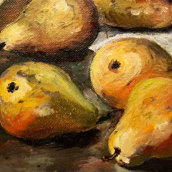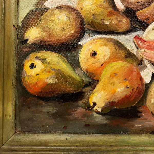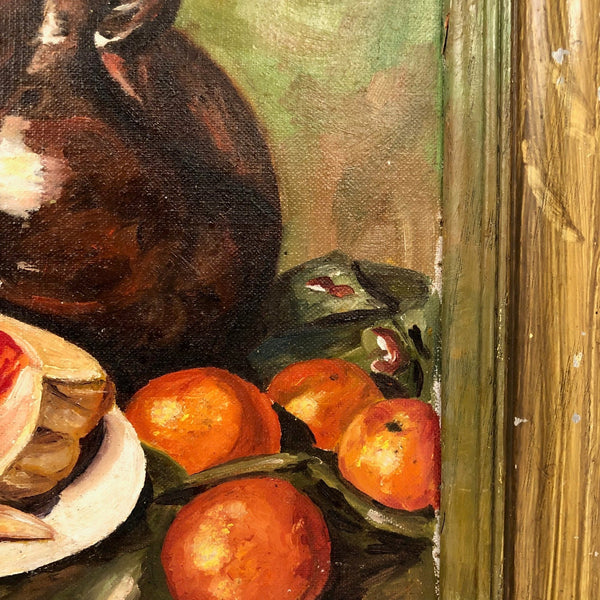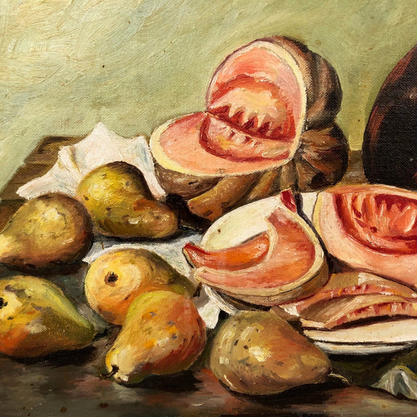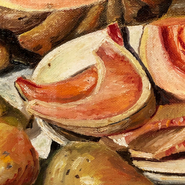 This is not a great painting, but I love it--in very large part because of that meat-like melon (with those very pork chop looking slices) which gives the whole thing a Chaïm Soutine sort of flavor in addition to lending it a certain eroticism! I also love the immediacy with which its maker kept right on going to paint the frame in the same palette. A perfect one for hanging amid a salon style wall of still life paintings, I'd say.