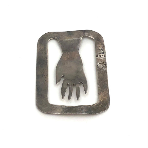 1 7/8 x 1 3/8 and in very good vintage condition. Marked Hecho En Mexico, 925 (sterling) silver.