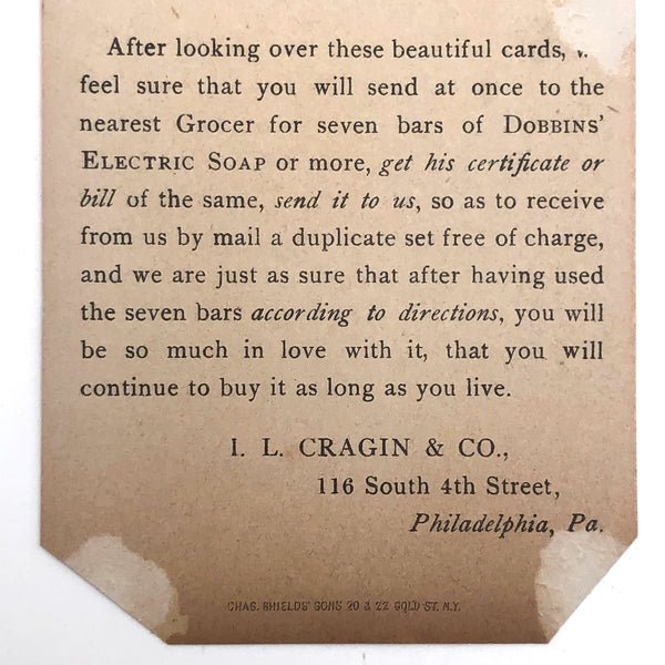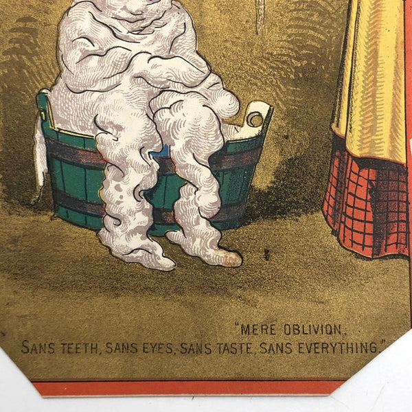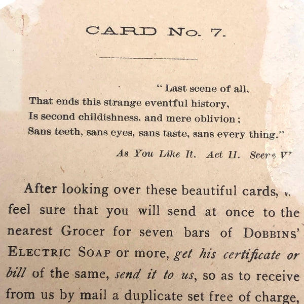 Such a fun one, with this great, weird, ghost-like soap figure in washtub. And rather odd choice of quote below: "Mere oblivion, Sans teeth, sans eyes, sans taste, sans everything," which we learn on reverse (or perhaps you knew already!) comes from As You Like It. Plus instruction to buy at least 7 bars of Dobbins Electric soap which, of used according to directions one will surely fall in love with and continue to buy for as long as you live. I think whoever handled the marketing for Dobbins must have been quite an interesting sort!