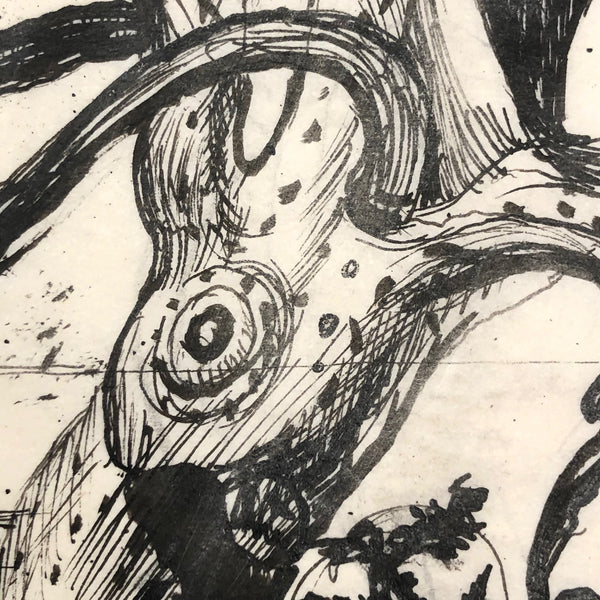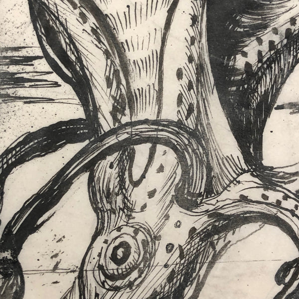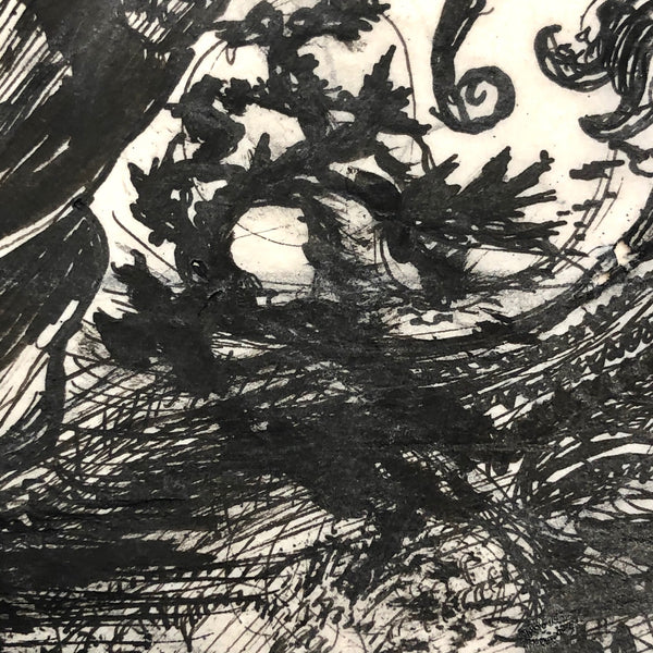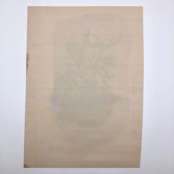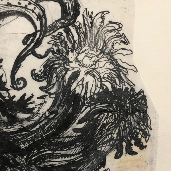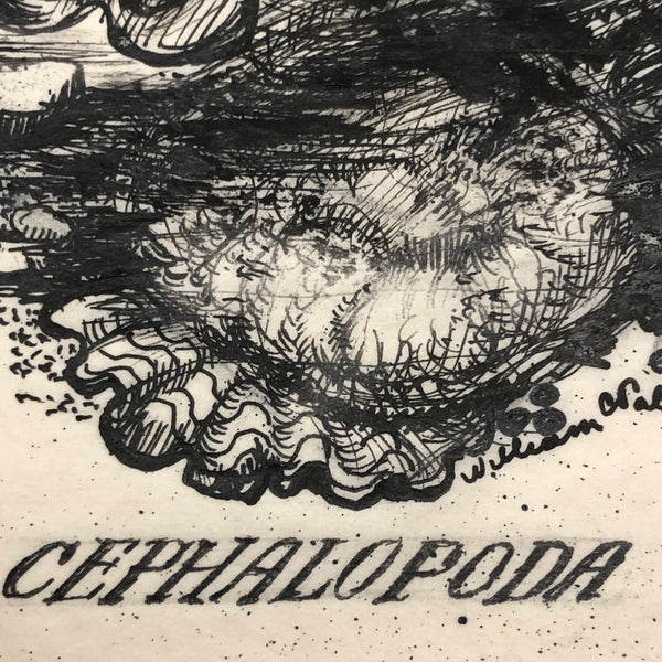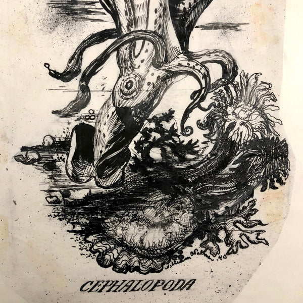 This is an original pen and black ink drawing by William Charles Palmer (signed and dated 1940 right above "Cephalopoda") executed on rice paper, then cut and mounted to white laid paper. I really love how old and dark and briny it feels, like something straight out of Jules Verne, and I imagine it may indeed have been done as an illustration for a book or publication about sea creatures, though am not certain.