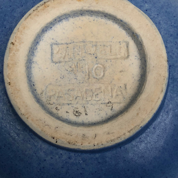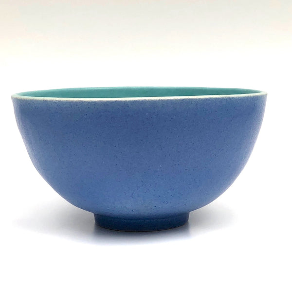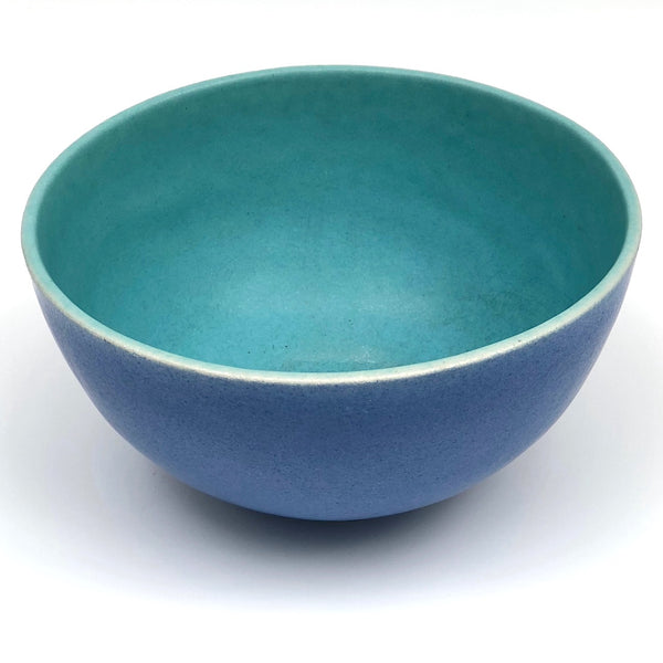 This bowl radiates joy--everything about it feels absolutely right, and it actually seems to glow! I believe it is quite an early example of Winfield Pottery, which was founded in Pasadena, CA by Leslie Winfield Sample in 1929. (Winfield later moved to Santa Monica, in 1946, and closed in 1962). While later pieces were made using molds, this bowl was hand thrown. It is made of semi-porcelain, and glazed a deep, mottled sky blue on the exterior and aqua on the interior--a striking combination.