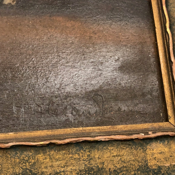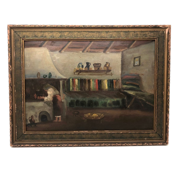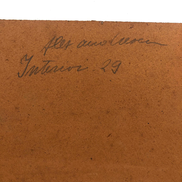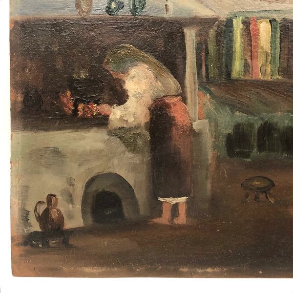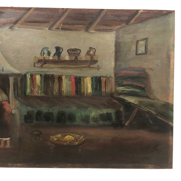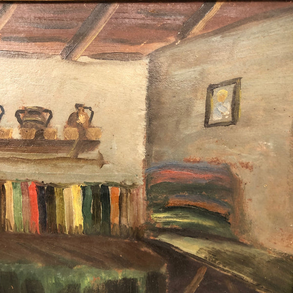 The back of this painting is signed and a signature is scratched into the paint on the front right corner too, but I can't clearly read either. What first drew me to the painting is that wonderful passage of colorful strips at center, which I take for a bolster or perhaps a blanket running along the back of a platform sofa or day bed. But then it's all the details that make it really sweet--the vessels lined up on the shelf above those stripes, the one picture hanging on the wall, the arched opening at the base of her traditional wood-fired oven, and the jug to the left of it and low table and tiny stool near the center of the room. For some reason it makes me think of the Gropius house in Lincoln, MA for the manner in which it captures a specific way of living within a specific type of architecture in a particular place, in this case a traditional adobe home in the Southwest in the late 1920s. Quite wonderful I think.