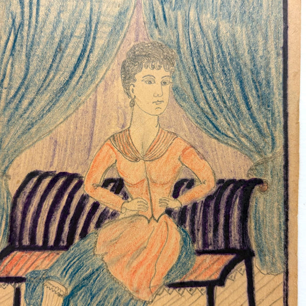 Paper 6 3/4 x 4 3/4” and in good condition, paper a bit brittle, I backed a couple of very tiny tears along bottom right edge with a bit of archival tape to shore it up. Graphite and crayon, late 19th c. I believe, found in Maine.