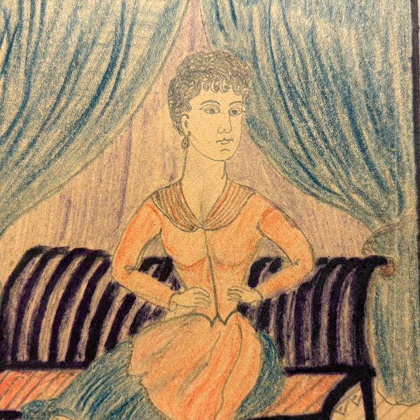 A second today by the same person who drew the woman with raised hand in garden (framed) that I've also listed today--because I have a few moments before 4pm and because I think maybe nice to see that the artist's sustained commitment to lovely ladies in fancy dresses with tiny hands and feet! Again with the very excellent, very sculptural treatment of the hair, and how proud this woman looks--and as if on the verge of ripping open her bodice like the blue curtains behind her, in libration! With an especially wonderful treatment of her stockings, again advancing the sense that she's poised to reveal her full self:)