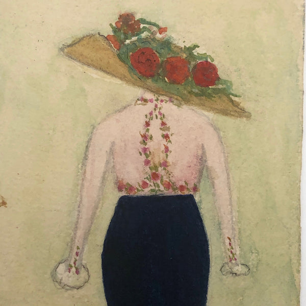 I just love the image of this decked out woman, with huge hat like a rose garden, completely concealing her head, and reiterated with garland-like trim on the back and cuffs of her jacket. My Spanish is, embarrassingly, close to non-existent, but the front text seems perhaps to be suggesting shopping now and paying later-- though I am not totally sure?!?