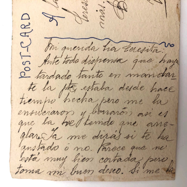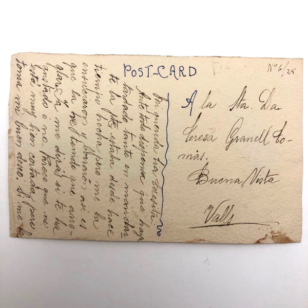 Sent to a Teresa Granell in Buena Vista, Valls (Catalonia, Spain) in May of 1913. Watercolor on watercolor type card. 3 1/2" x 5 1/2" and in very good antique condition.
