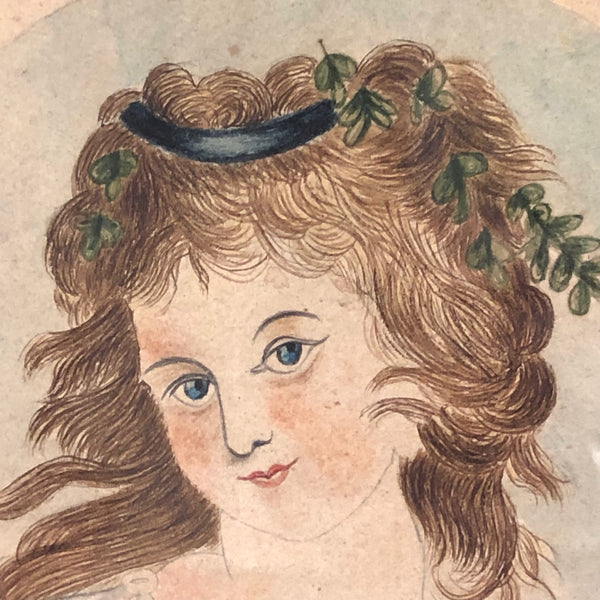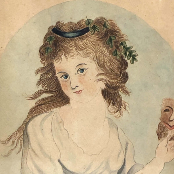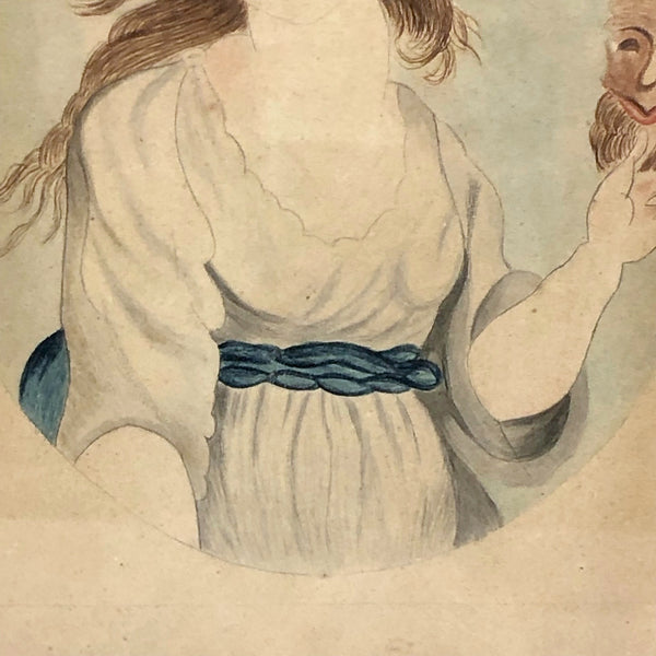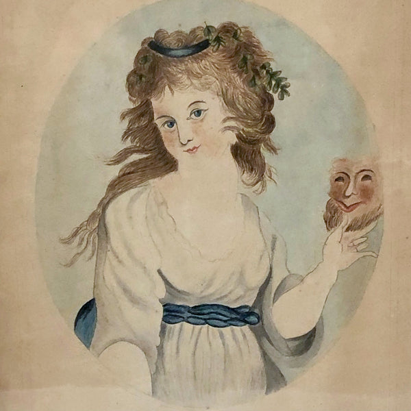 There seem to be a fair number of i18th and 19th c. images of young women holding masks, inspired I believe by the popularity of masquerade balls; whether this folk watercolor was based on a specific popular print I have not been able to discern, but it may well have been. Whatever the case, I take it on its own terms and think it's fabulous, with the big blue eyed, side cast gaze of this young woman seeming to sparkle with a coy mischievousness. I really love the treatment of her hand, too, as she holds up the mask, with those two closed fingers seeming as if to signal a specific secret message. A handy subject for juxtaposing male/female and young/old, which serves to heighten her youthful beauty and also, happily, to pack in a certain sort of transgressiveness!