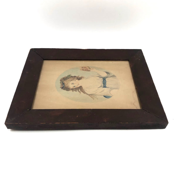 Framed: 11 7/16” x 9 1/4”, as found, in a nice period frame with wood backing, where it has clearly lived a long time, likely original to it. Sight: 8 1/2” x 6 1/4”. All in good condition, with a little staining along the left bottom visible edge of paper.
