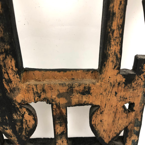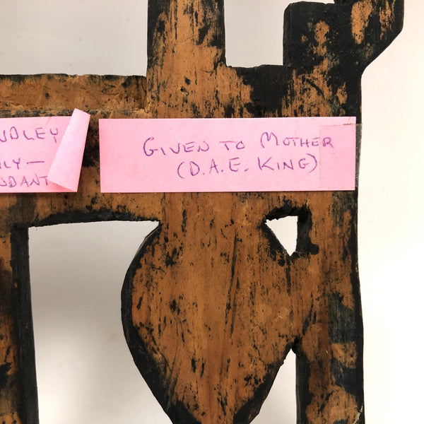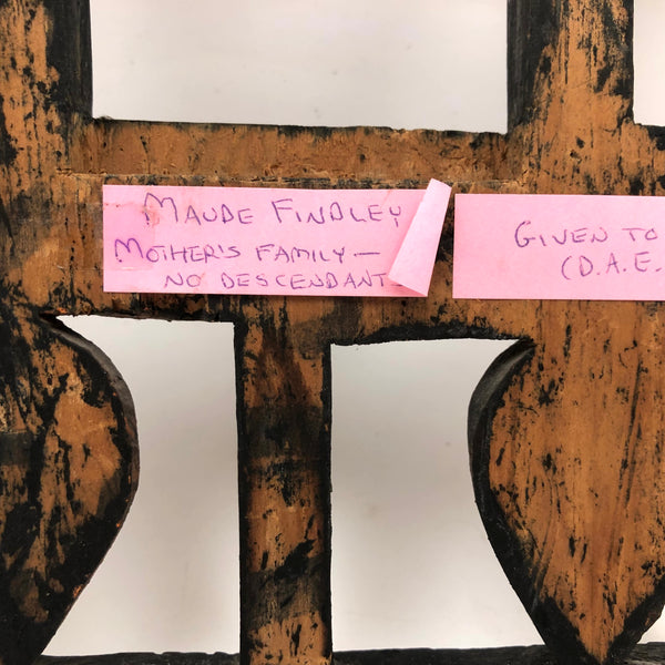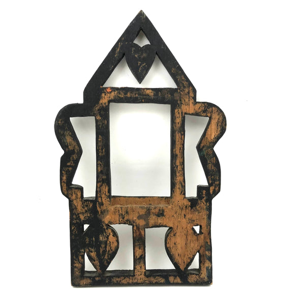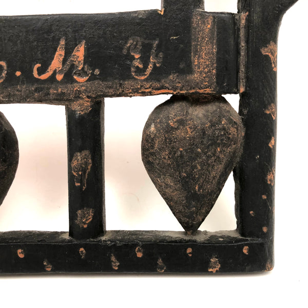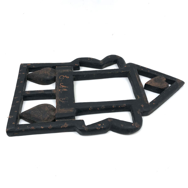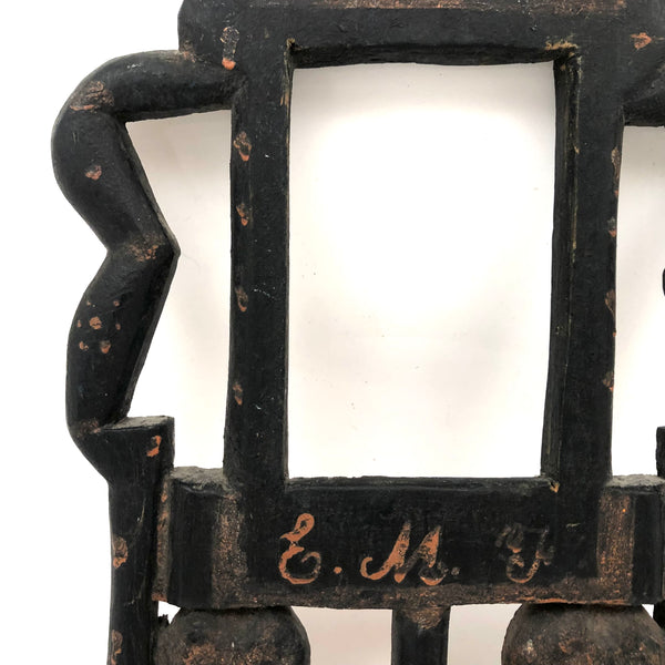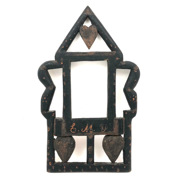 Certainly this was made to function as a frame, but I'd be just as inclined to leave it empty and hang it just as it is, so lovely. All carved from one piece of wood, with a wonderful play of curves, angles, and straight lines, and clad in black and red paint, time softened but still strong, with the monogram E. M.F painted in cursive along the bottom edge of the frame. Clearly made with lots of love for a very loved one, with hearts everywhere. Super.