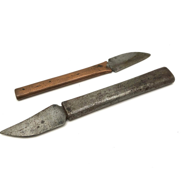 I find these quite beautiful, and they're also a pleasure to use--a sort of homemade substitute for exactos, or Opinels. I don't believe prison shivs, but perhaps stealthily made in shop class, who knows? Both with inset steel blades, which remain very sharp. Pretty much indestructible and quite satisfying things.