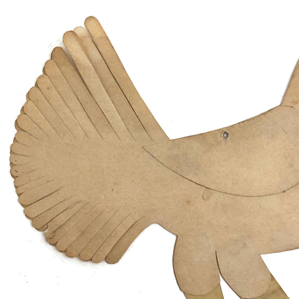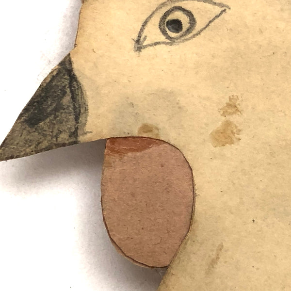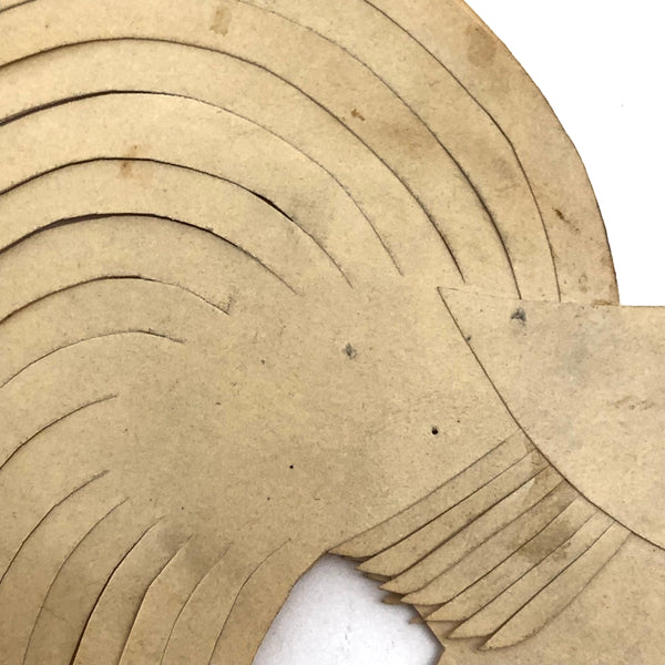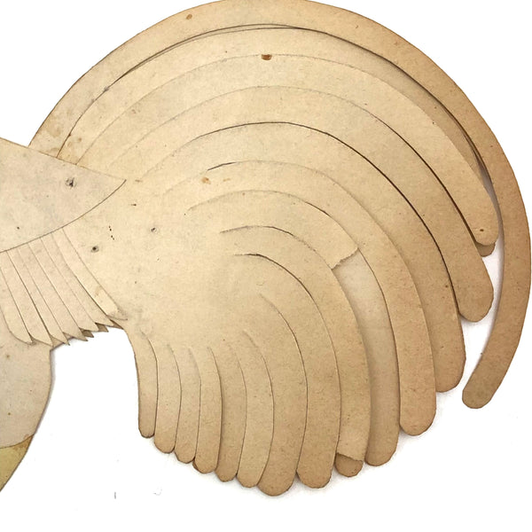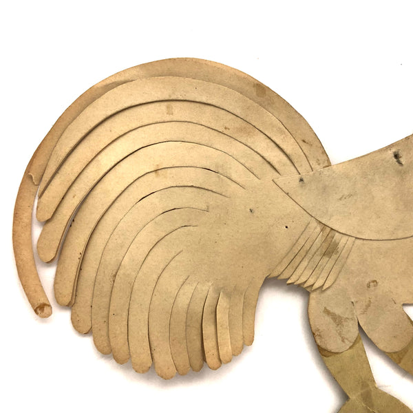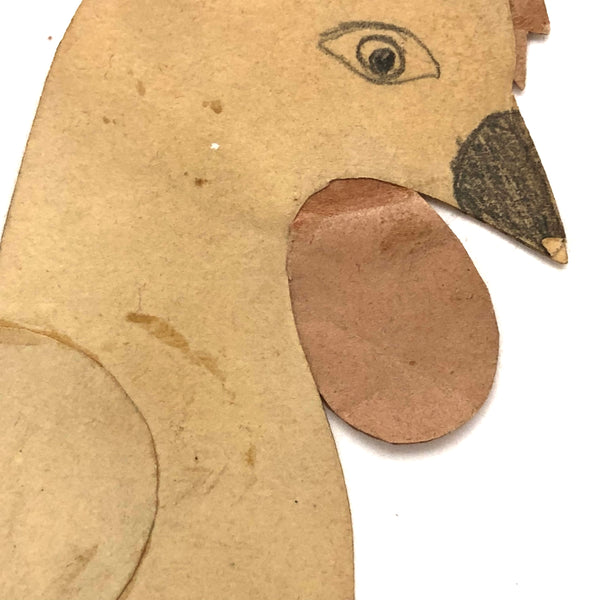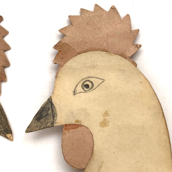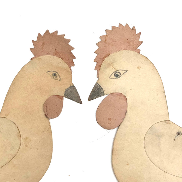 A total delight to find this pair, the likes of which I have not seen, but the tails of which remind me a bit of old cardboard quilting templates. One is a rooster, the other a hen, and so a pair of barnyard lovebirds! Double-sided, with watercolored combs and wattles and claws, and graphite drawn eyes and beaks. Most definitely frame worth.