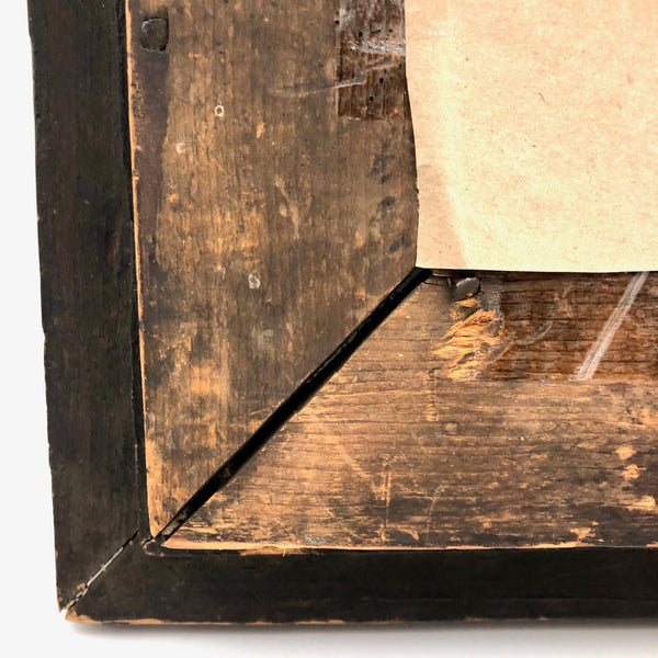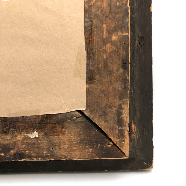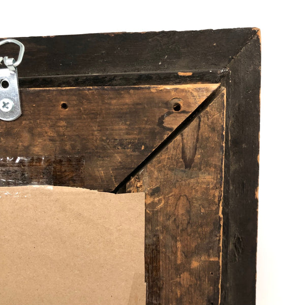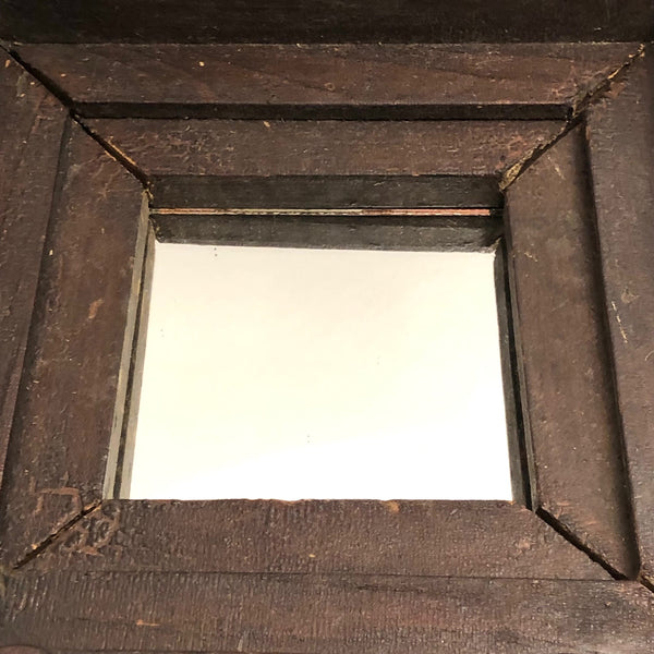12" x 12" x 2 1/2" d. Very good overall condition, sound and stable. Newer mirror as noted, backed just with brown paper.