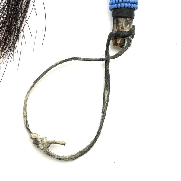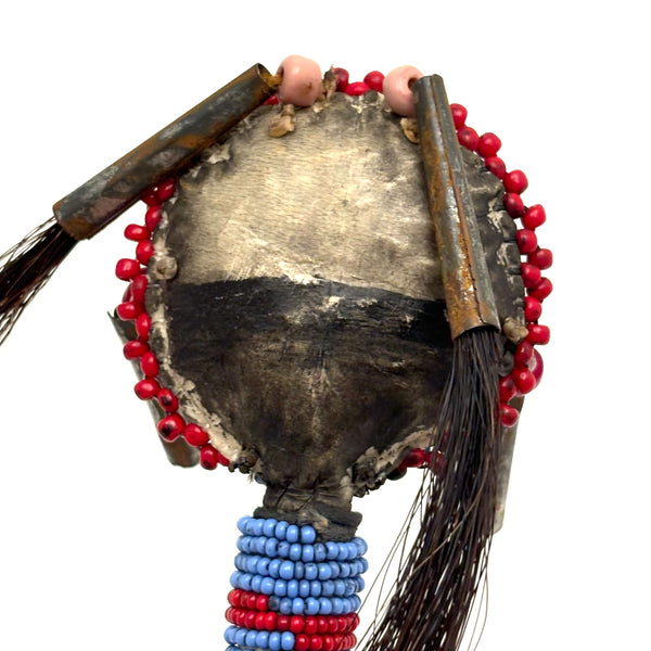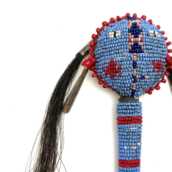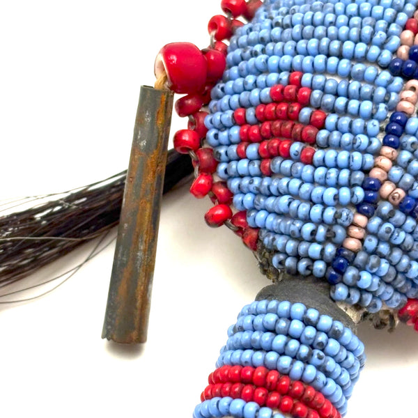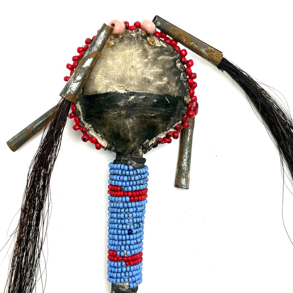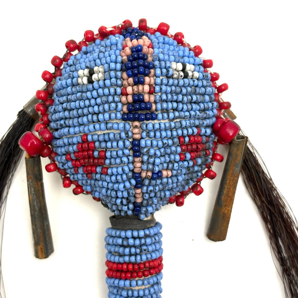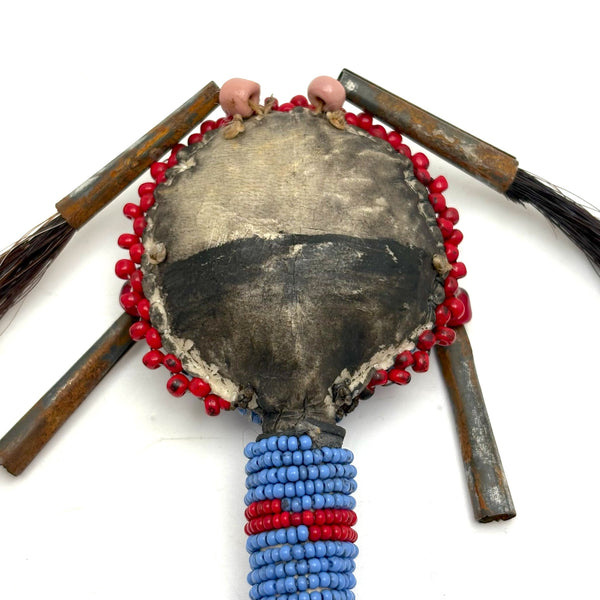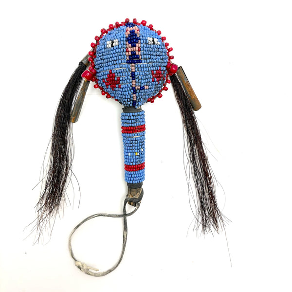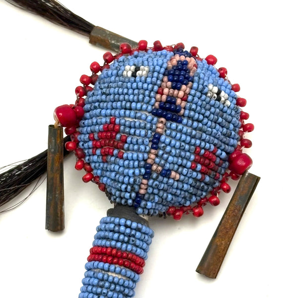 I am not an expert in Native American beadwork, but have been lucky to find a couple of old beaded hide Sioux balls over the years, and upon spotting this rattle in a fairly unlikely place believed it to be the same--and indeed, a little research makes me sure of it. (I have found a fair number of figural "amulets" out there of a very similar manner, though rattles seem much scarcer.) Made for a child's hand, with these wonderful bright eyes, red cheeked beadwork face, and what I believe is black horsehair pulled through tin cones. Mid 20th century or so, believe.