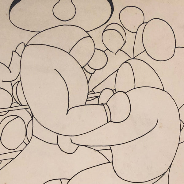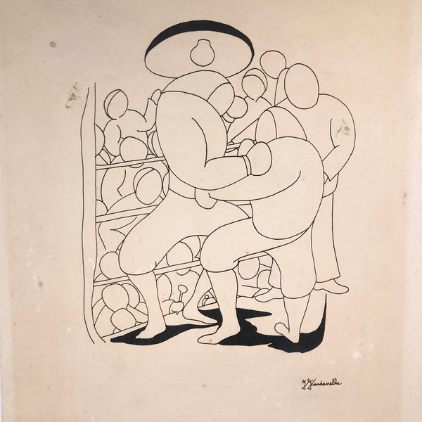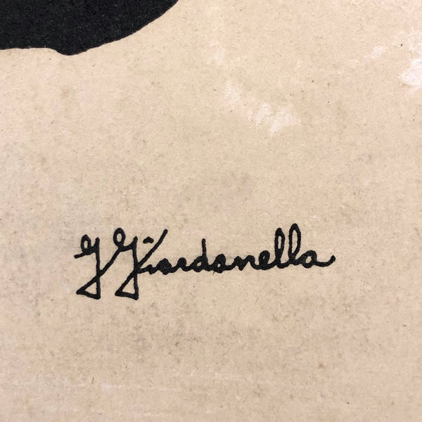 I haven't turned up anything of the artist who did this (based on my reading of the signature, G. Giardanella) but I know I have seen a related piece by this same artist elsewhere in person. In any case, while there is some cracking/creasing to the board (see detail photos) along the top of the drawing (more visible in some lighting that others), I think it's a really great drawing portraying a boxing match that feels very intimate and sensual. (And with all those curves and faceless heads, it also looks a bit like fencing!) Quite beautifully rendered, which makes me believe the artist was of note.