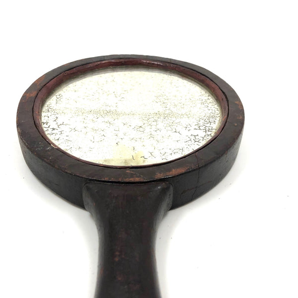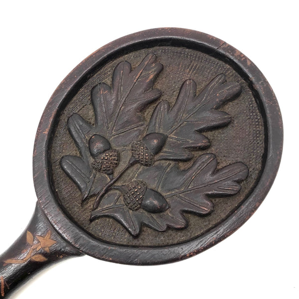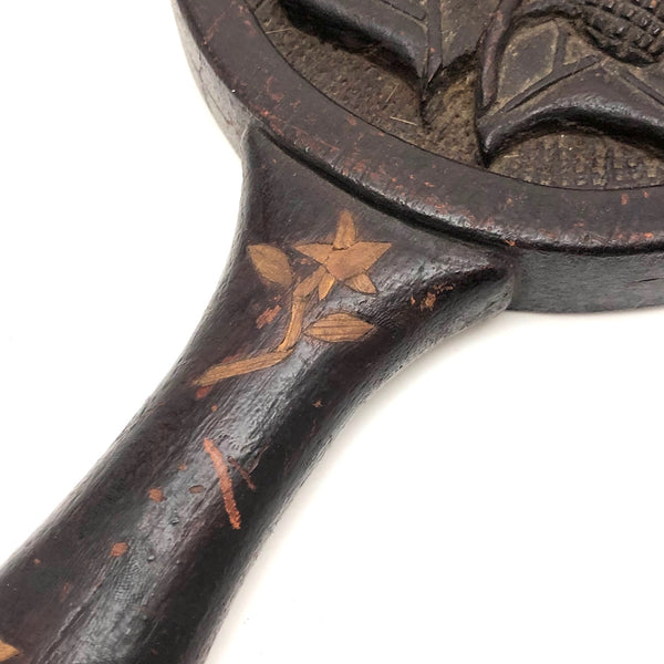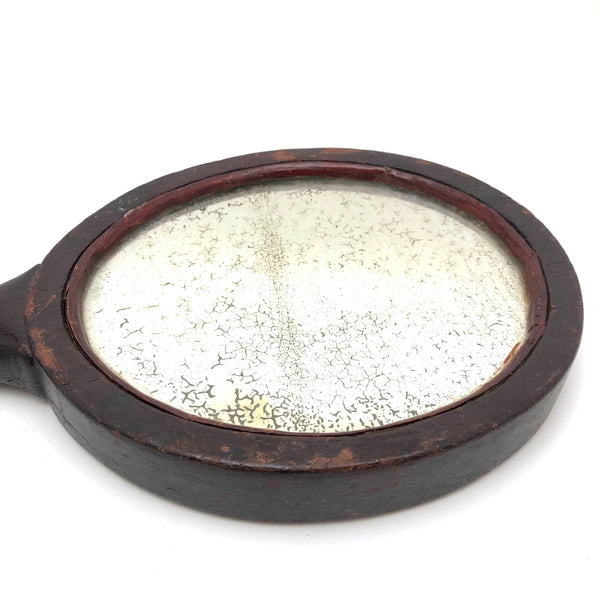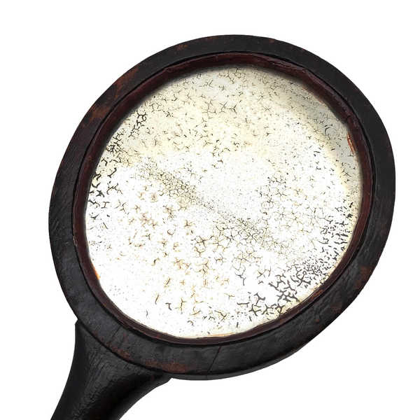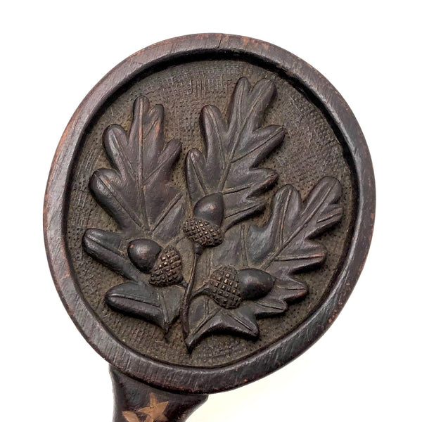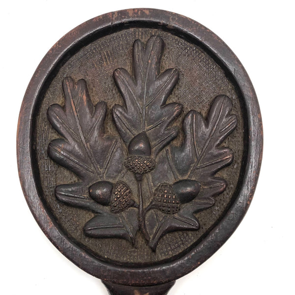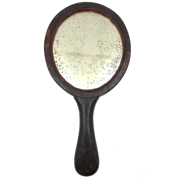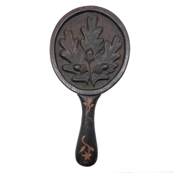 Super folky and also beautifully done, this is a hand-mirror I'd be very inclined to hang on the wall, with one nail to either side of the bottom of the frame, so easy to take down and also to show both ways. Carved of oak, hence the relief carved oak leaf and acorns, with inlaid flowers on stems at either end of the handle and a now perfectly distressed inset mirror, held tight with the interior rim painted red. Surely a gift for the sweetheart of the maker, this really teems with love and warmth. Heavy, substantial, charming.