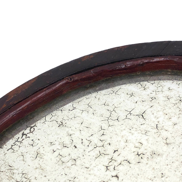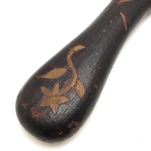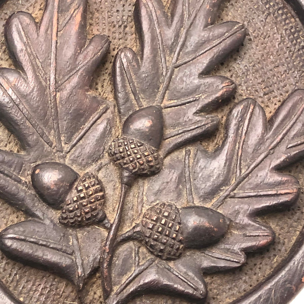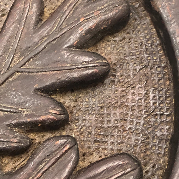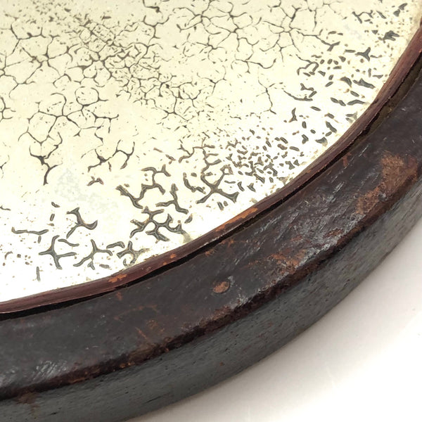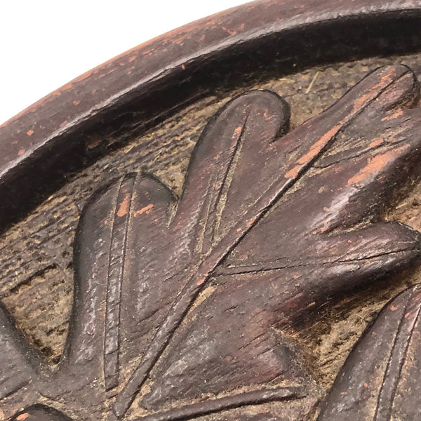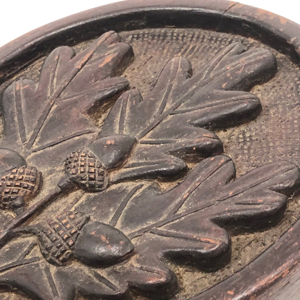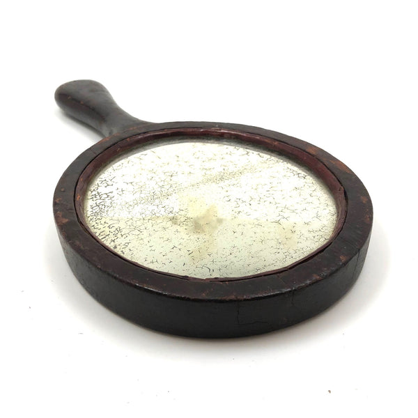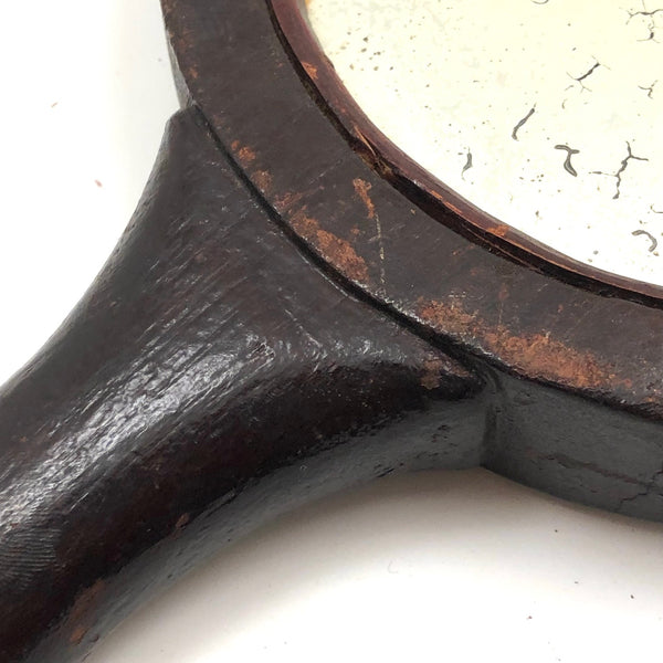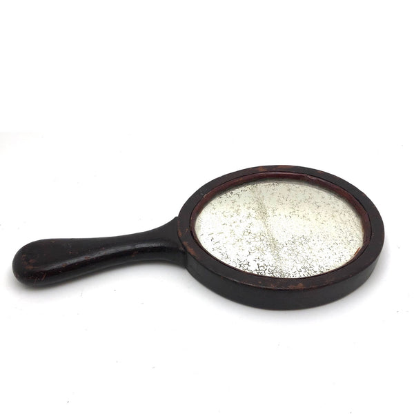 Super folky and also beautifully done, this is a hand-mirror I'd be very inclined to hang on the wall, with one nail to either side of the bottom of the frame, so easy to take down and also to show both ways. Carved of oak, hence the relief carved oak leaf and acorns, with inlaid flowers on stems at either end of the handle and a now perfectly distressed inset mirror, held tight with the interior rim painted red. Surely a gift for the sweetheart of the maker, this really teems with love and warmth. Heavy, substantial, charming.