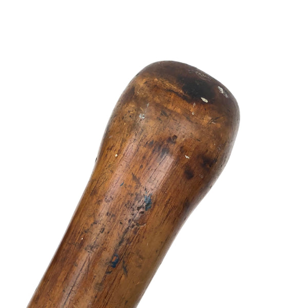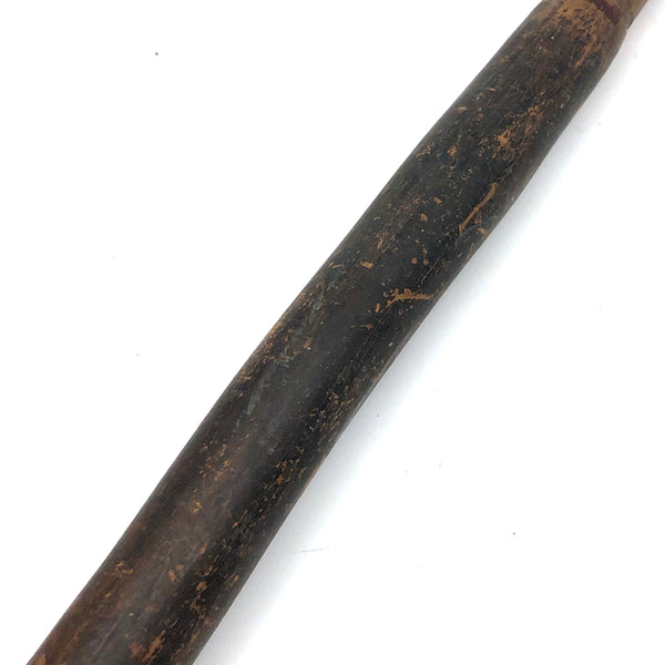 Approx 32 3/4" long x 1 3/8" w x 1 7/8" d. Wood smooth and darkened from use, and becoming considerably darker toward the bottom of the stick. It appears there was once a ferrule covering the end of the stick, long lost.