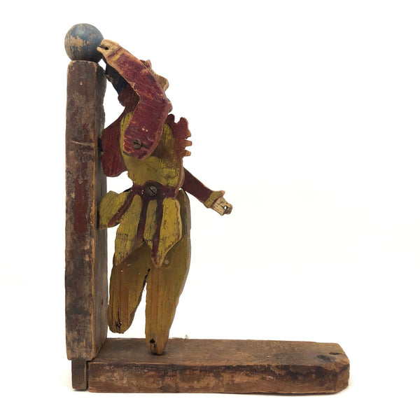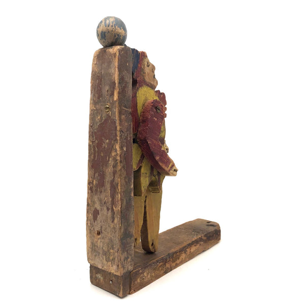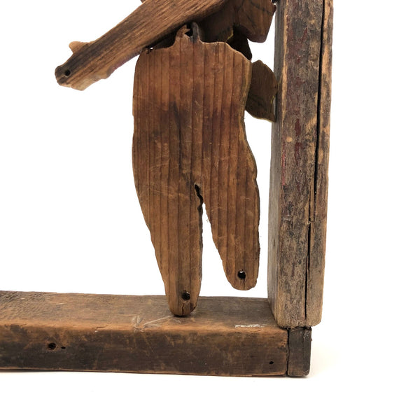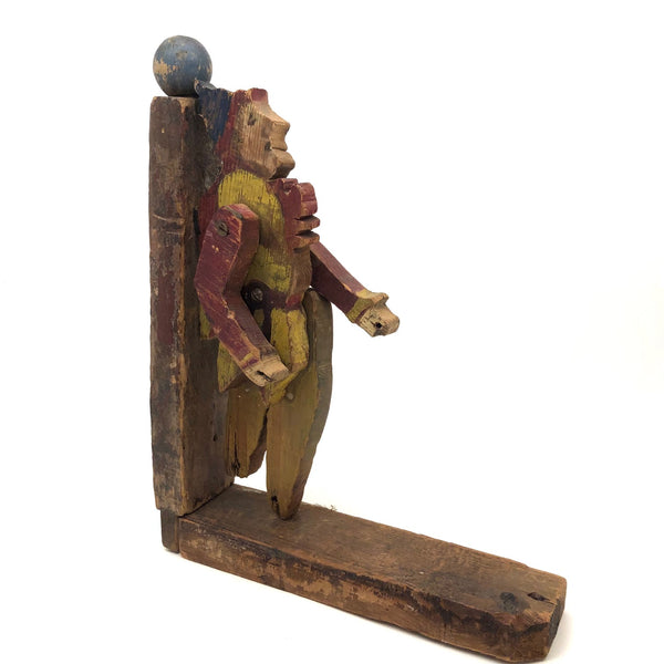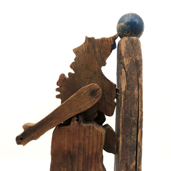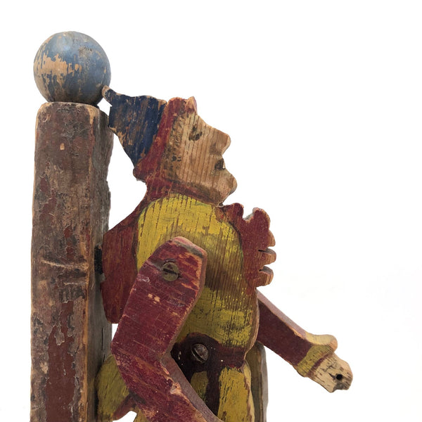 I’m pretty sure this was once part of a whirligig, but think it's pretty perfect just as it is now, with this clown (who, though I doubt intentional, looks like a woman to me, and also a bit witchy) attached by a couple of screws to the plank behind her, which terminates in a baby blue ball, giving a pom pom to the tip of her darker blue hat! Her arms move, as do her legs, though they have no feet, and I must say with one arm lifted over her head she look a bit provocative! Painted on one side, pencil drawn on the other, and with her legs just balancing on the horizontal plank of the frame; she is only attached to the vertical plank.