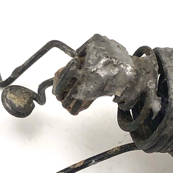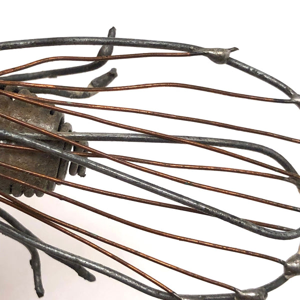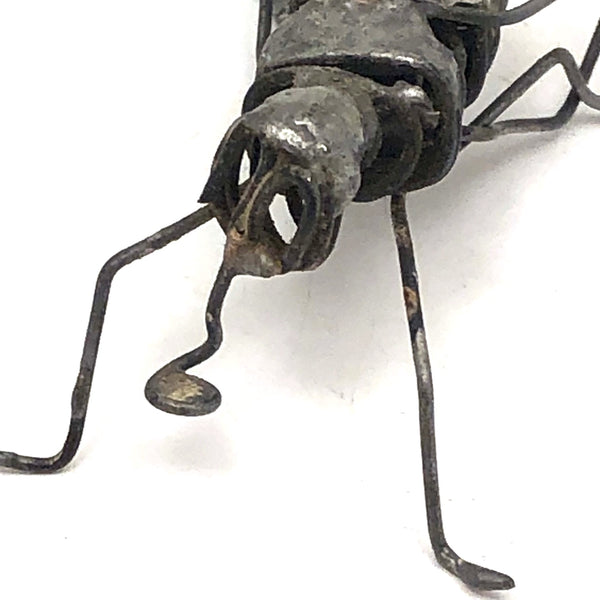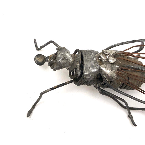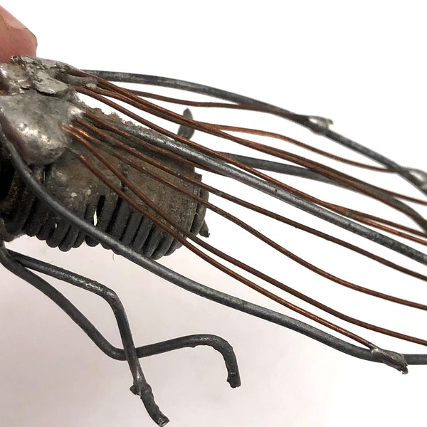 At first I thought perhaps this was meant to be a cicada, but now I think maybe a long tongued fly; really, that long spiral out front is like the rolled tongue of a butterfly, or that of a salamander! Whatever the case, quite a wonderful bug it is, I think, composed of what looks to me a combination of iron, steel and copper wire creatively and dexterously welded together, with a lovely delicacy that comes especially from the treatment of the wings, but the long legs too. Happily set or perched most anywhere.