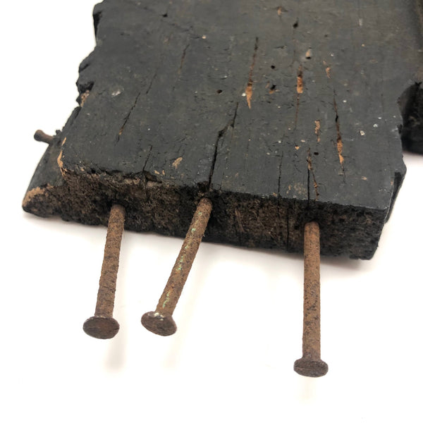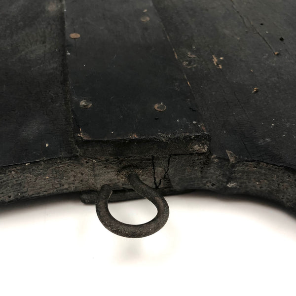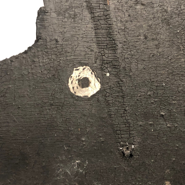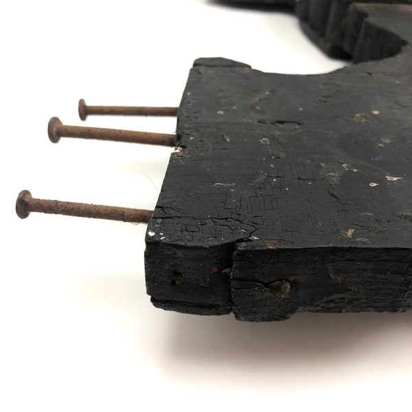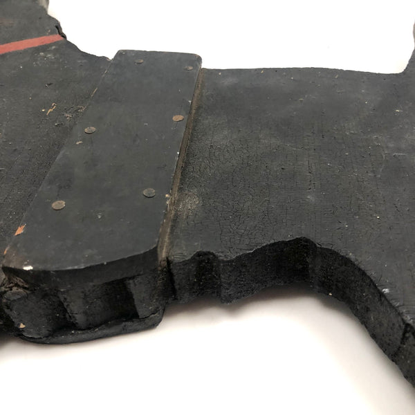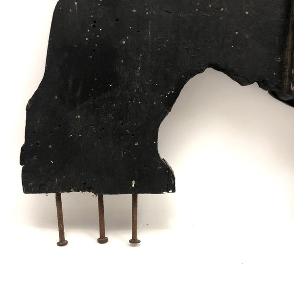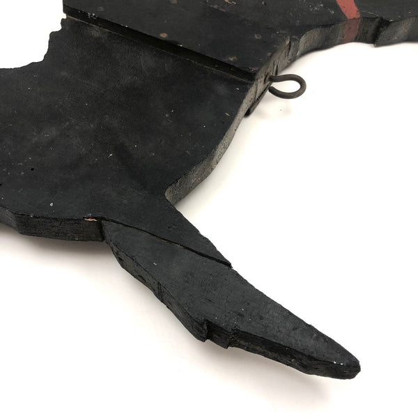 16 1/4" l x x 14 3/4" t (including nails), 1 5/16" thickest. Good, sturdy, condition with a little white/gray spotting against the black paint on one side and a split to the wood of the tail, I'm guess fixed via glue at some point and now totally stable--all as pictured.