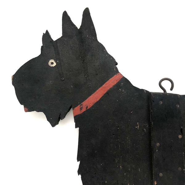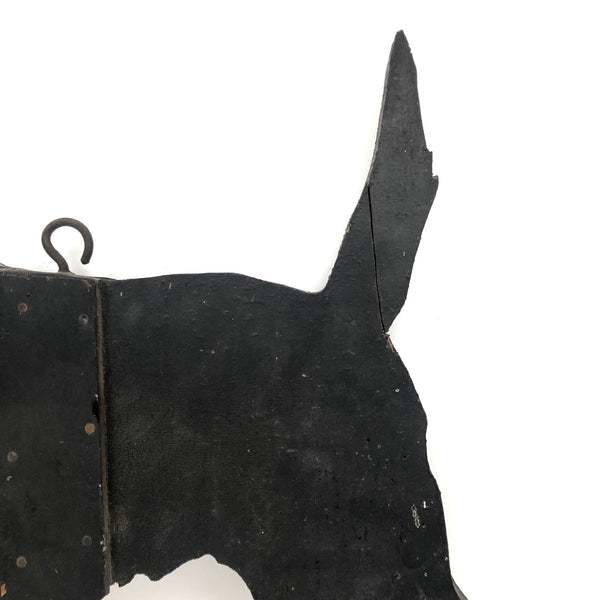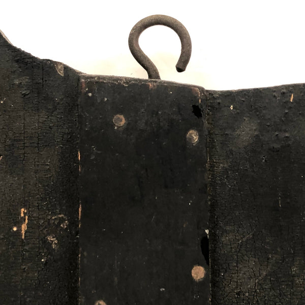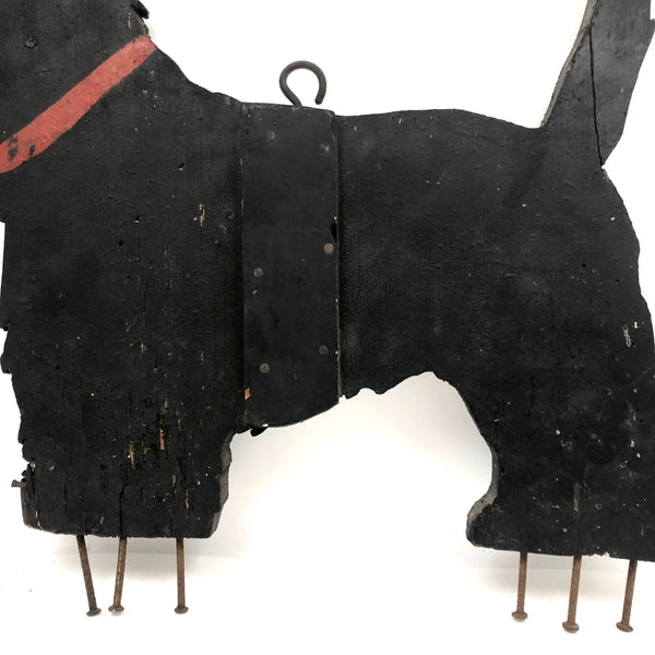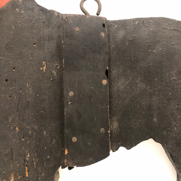 Often with these old wooden cutout animals the face is the selling point, as it often most reflects the individuality of its maker, but here it's this beautiful nailed on extra layer of mend/reinforcement (actually an extra layer on each side) straight down its center, combined with the three long nails extending from each foot, together giving this sweet pup some real tooth! That the center mends run straight up to an eye hook for hanging also makes them feel rather like the bands of a harness, and as if a leash might be latched to the hook to take this guy for a walk, on nail stilts!