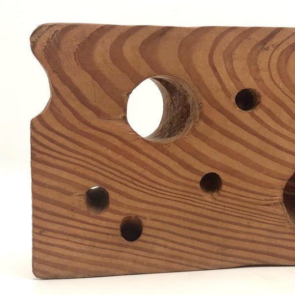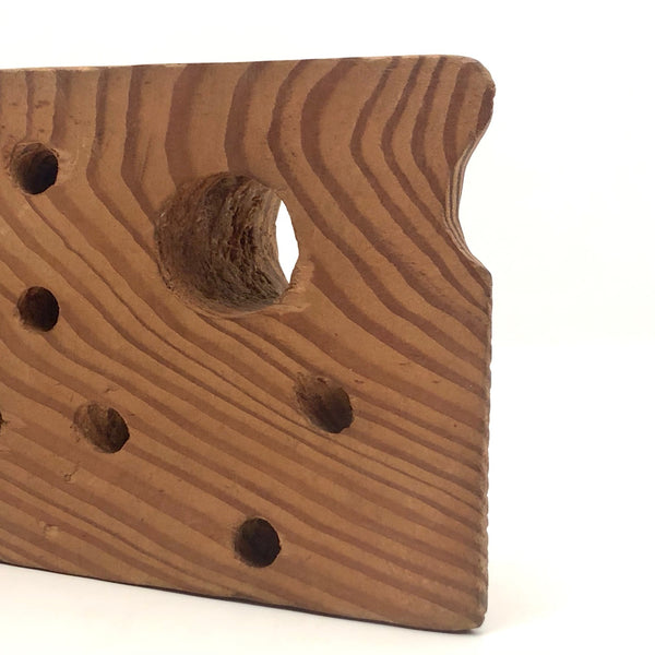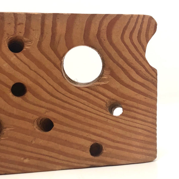 I've had a few vintage brass cheese wedges in the shop, but this is the first wooden one I've found, clearly handmade from a scrap chunk of wood, and well worth the effort I'd say. The holes in the top are plentiful but fairly small, keeping pens or pencils sitting high in the holes or also making them great for holding watercolor paintbrushes, say, brush side up.