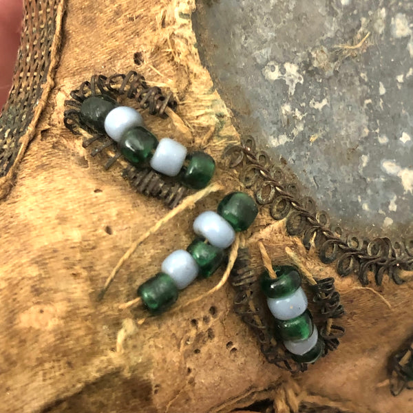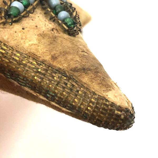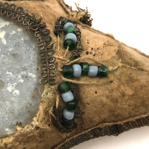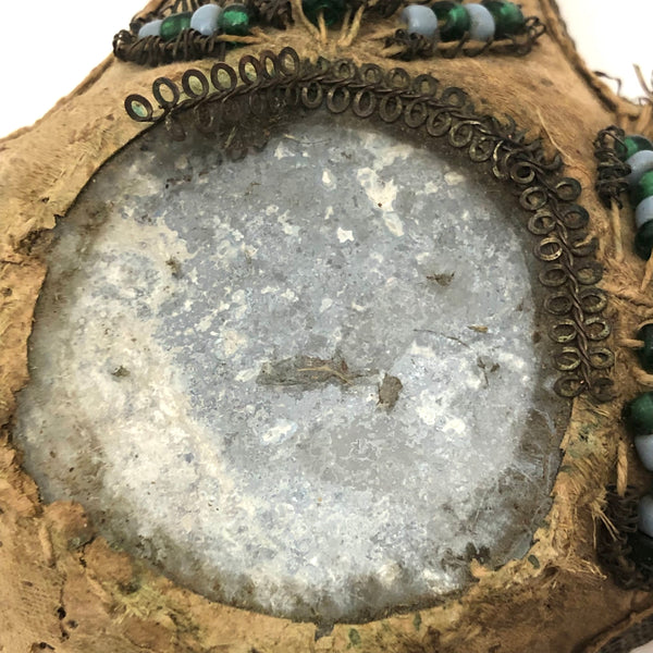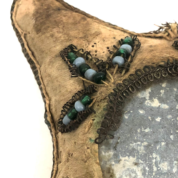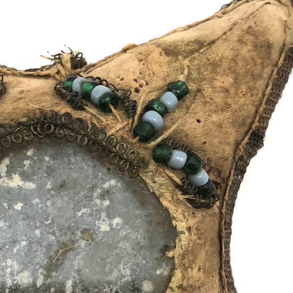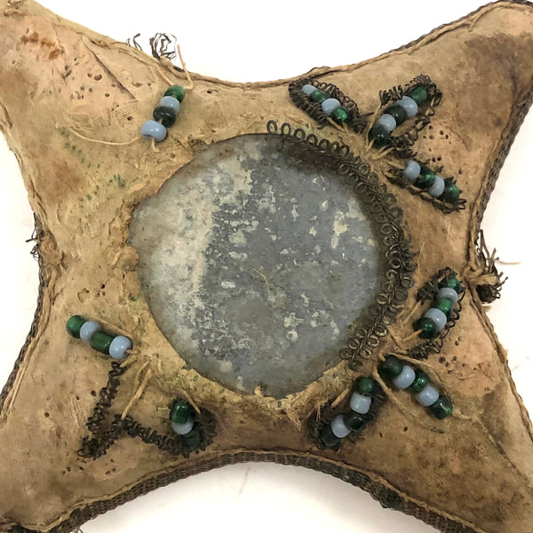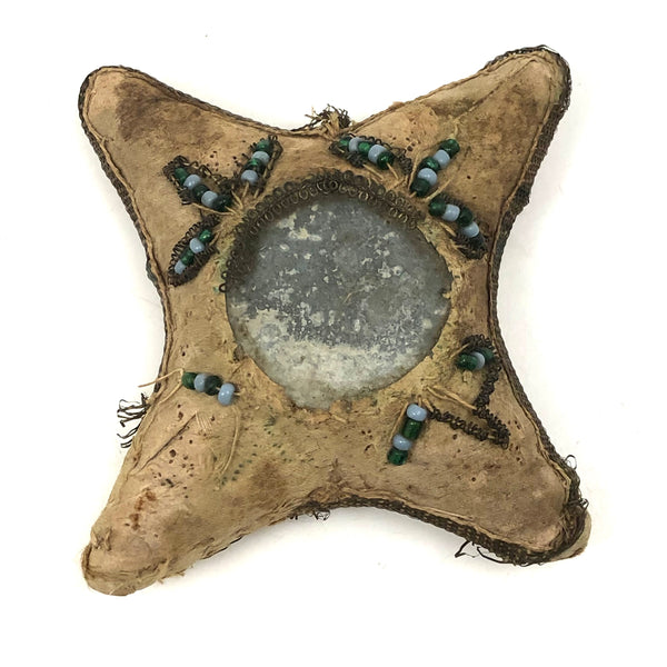 This has lost some of its beading and some of the fancy wire that once entirely framed the mirror, but I find it such an extraordinarily beautiful and special feeling thing, there was no way it wasn't coming home with me. I've never seen another like it, feeling much like a fragment mirror, but all the better for that mirror being embedded in a four point star sewn of hide, with beading at the corners and woven metallic thread around the sides. 19th century Native American I'm quite sure, and I would guess made to function as a pin cushion, though feeling of quite a different ilk than most one sees. There's a jewel-like quality to the mirror that feels quite magical and otherworldly.