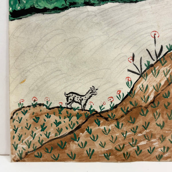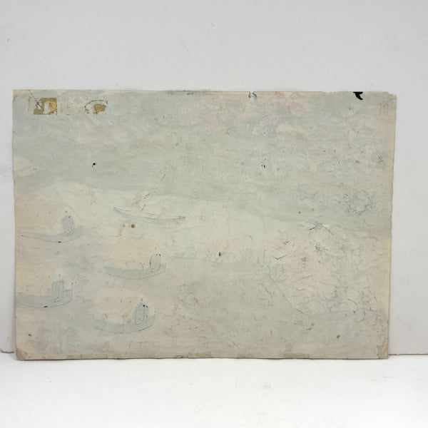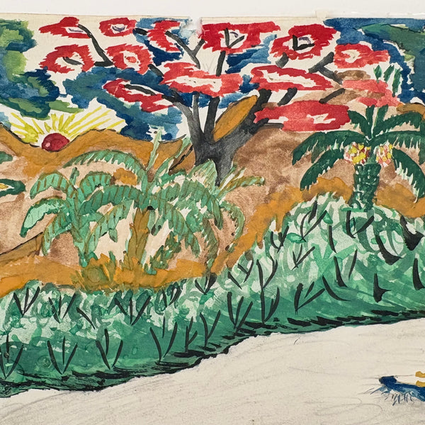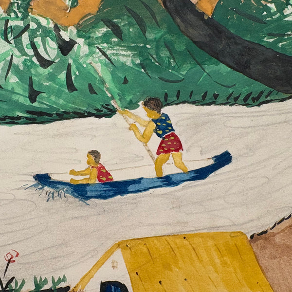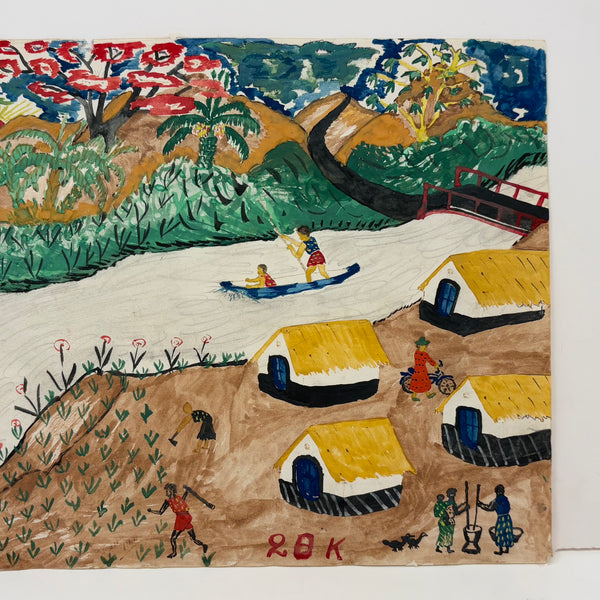I purchased this and a second watercolor by the same person at Brimfield, then immediately liberated them from old mats and frames upon returning home in order to really see them; they needed to see the light of day--and the colors in this one are especially fantastic. (All they need now is to float against white in a very simple, clean, white or black frame.) The other is signed, twice--Tshi Mua and Tshibanda Muayabu, I believe most likely Congolese, and presuming so my guess is painted toward the tail end of Belgian occupation (1950s) or just after. I love the many small moments captured here, portraying the simultaneous lives of many women--and their different circumstances in the process, from the black women working the fields in the foreground to the light skinned woman in red dress on her bicycle, to the young boaters on the river. And then the lone goat. This and the other feel like portraits of life continuing on amid ever-changing circumstances, and finding beauty where it lies.