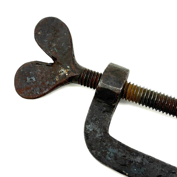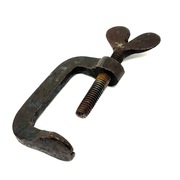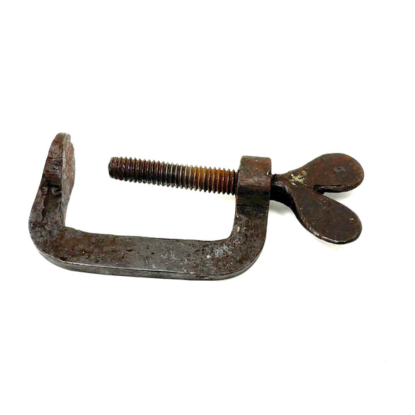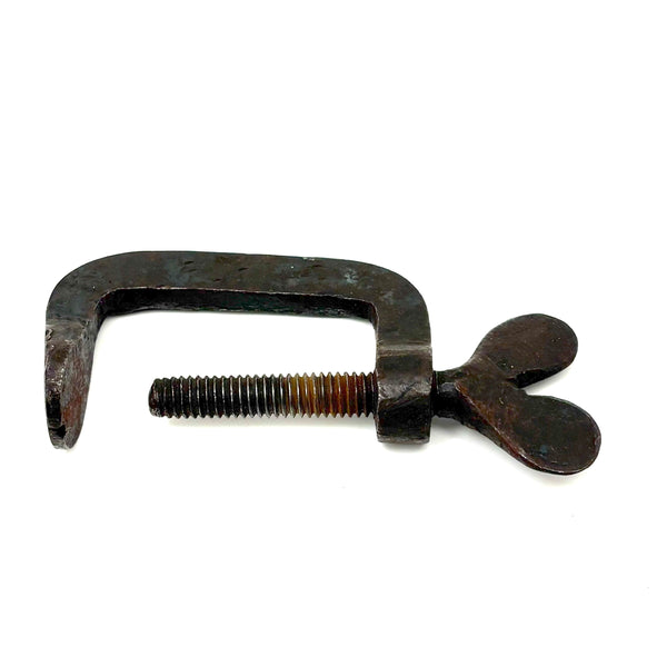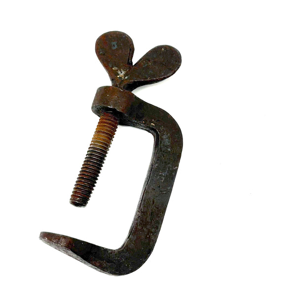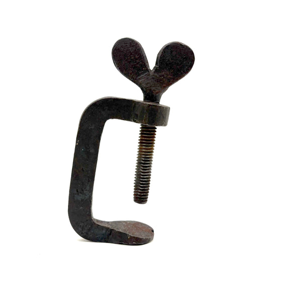 The is a 19th century hand-forged iron quilting clamp, with one of this sort often referred to as a "heart clamp" for the heart shaped finial on the screw. It would have been used for clamping the fabric layers of a quilt (top, batting, backing) to the rails of a frame while working it (sparing the quiltmaking from laborious pinning, etc.)