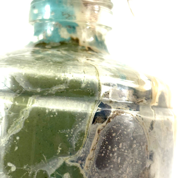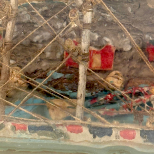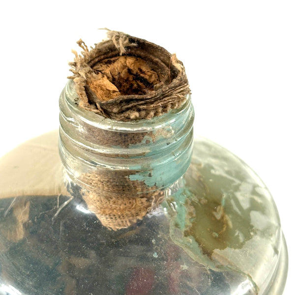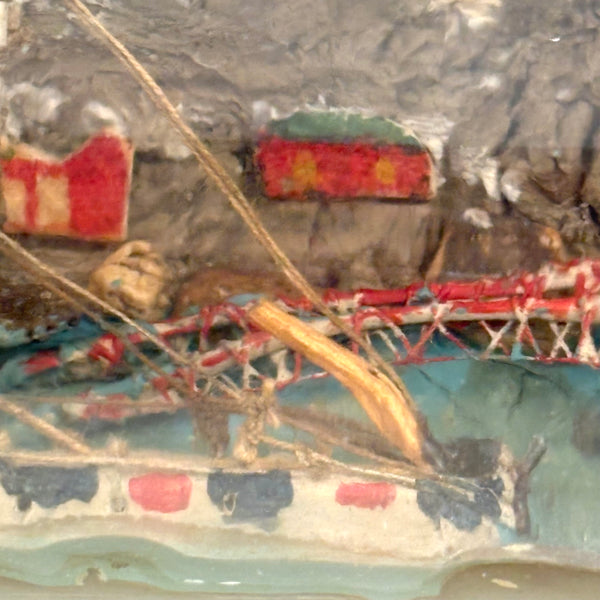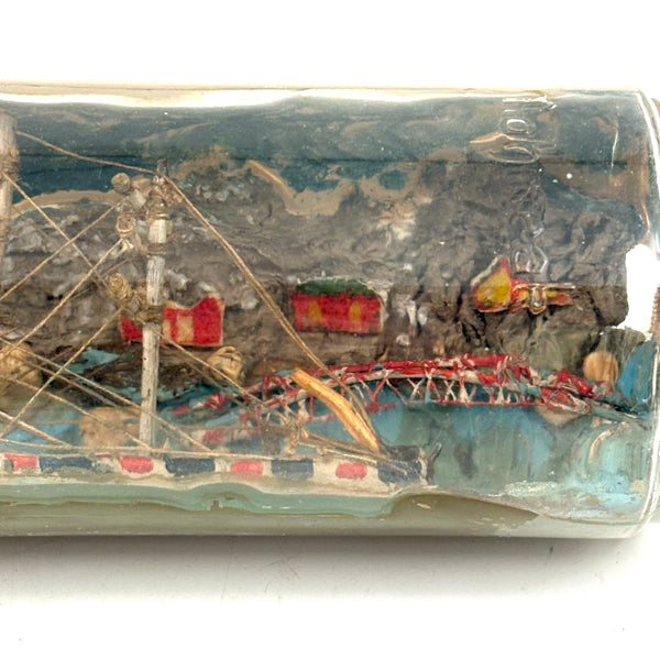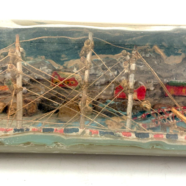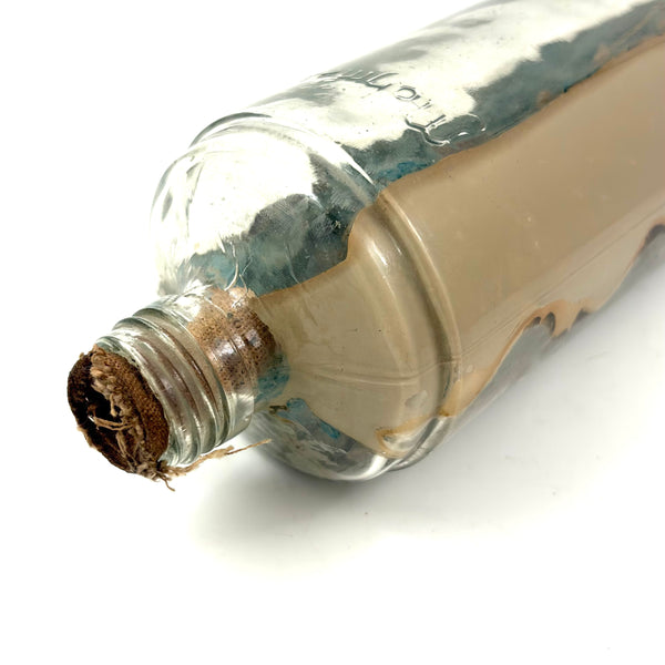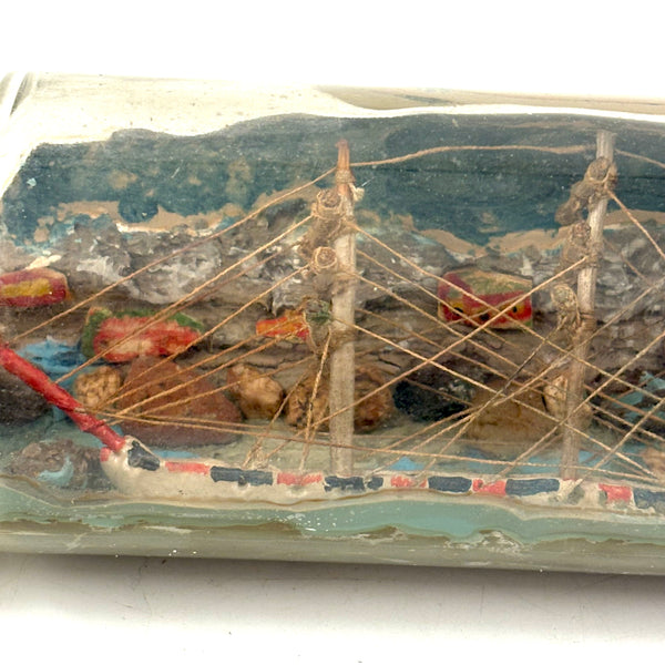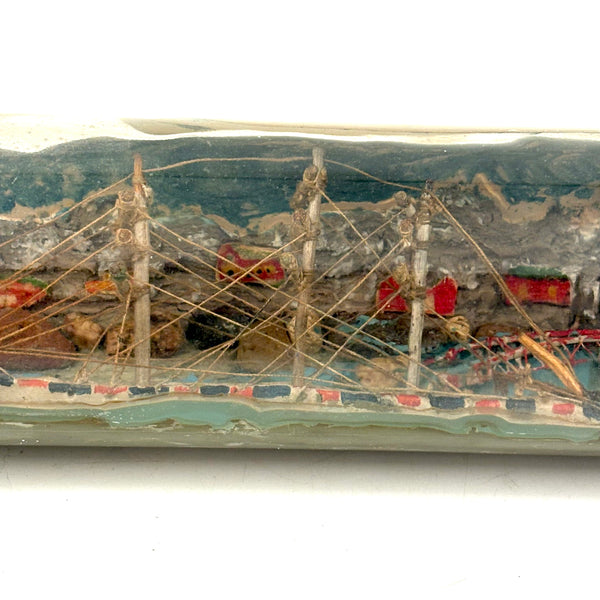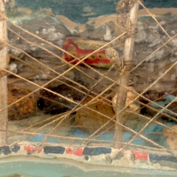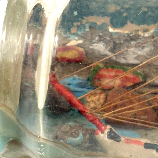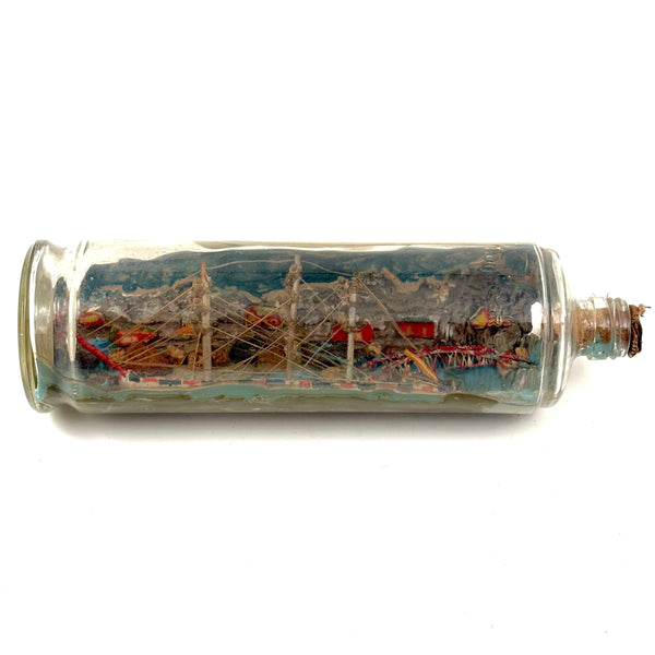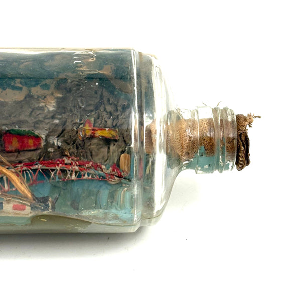 I love an old ship in the bottle, and will always marvel at them, but am fussy about the ones I like, preferring very folky ones, with lots of color and lots packed in, as is the case with this one. Fabulous play of strings on the masts, colorful paint on the hull and houses on the shore behind, plus gray painted mountains, with what I believe are actual stones along the shoreline, and an arching bridge at far right too. With canvas/burlap rolled up and stuck into the opening (there may be cork at the center of it, a bit hard to tell)--which has done the job very well, as there is next to no dust inside. The bottle is a Mohan Meakin rum bottle, earlyish 20th century I believe.