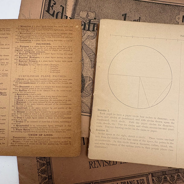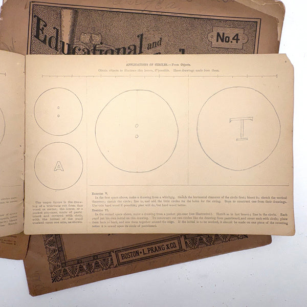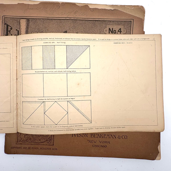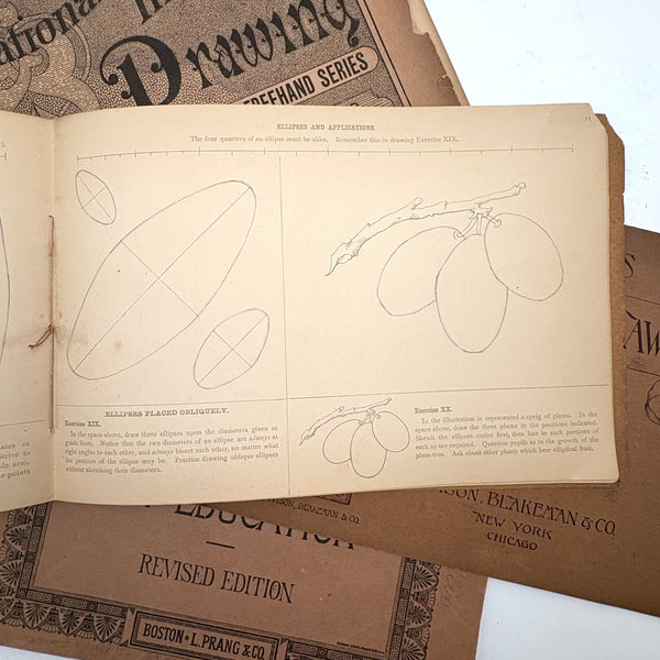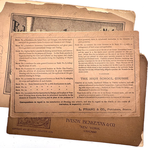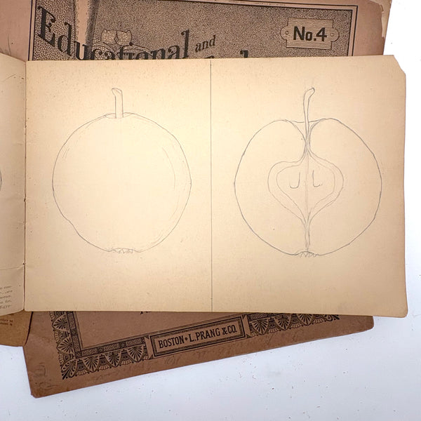 Whites, 1887, 9 3/16" x 6 3/16", 20 numbered pages, all completed, front and back covers detached. Heath, 1895, 9 5/8" x 7 1/2", front cover detached, back cover missing, 8 leafs, 6 pages with graphite drawings. Prang, 8 5/8" x 5 3/4", 20 pages numbered, covers attached, 1st 8 pages with graphite drawings.