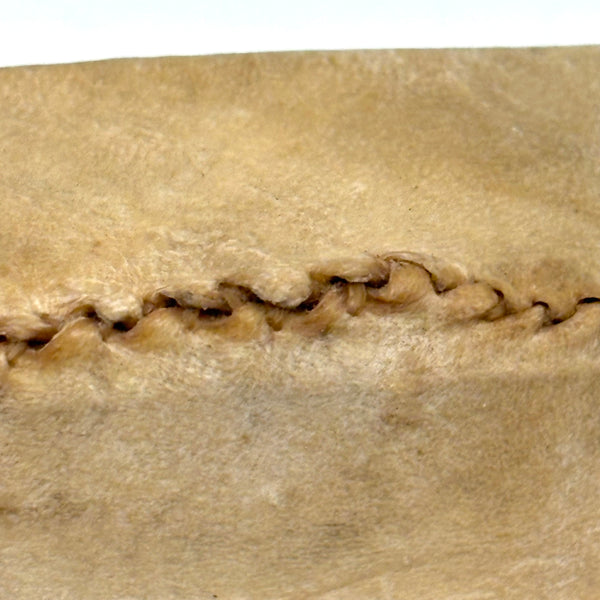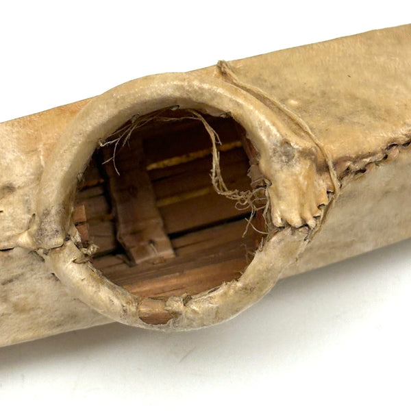 12" x 1 3/8" x 1 3/4" t. Good condition, with one small hole in the hide right around the rim of the seat and a few loose ends of sinew thread around that perimeter. Sturdy and sound, nice patina, and sits up on its own.