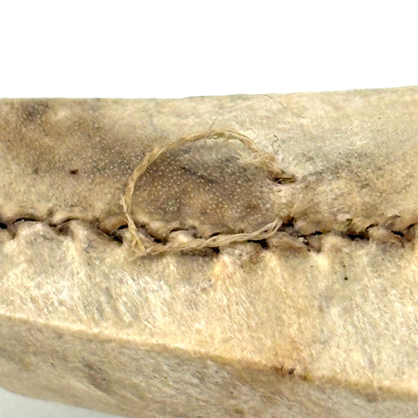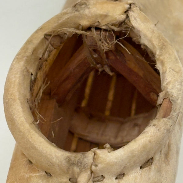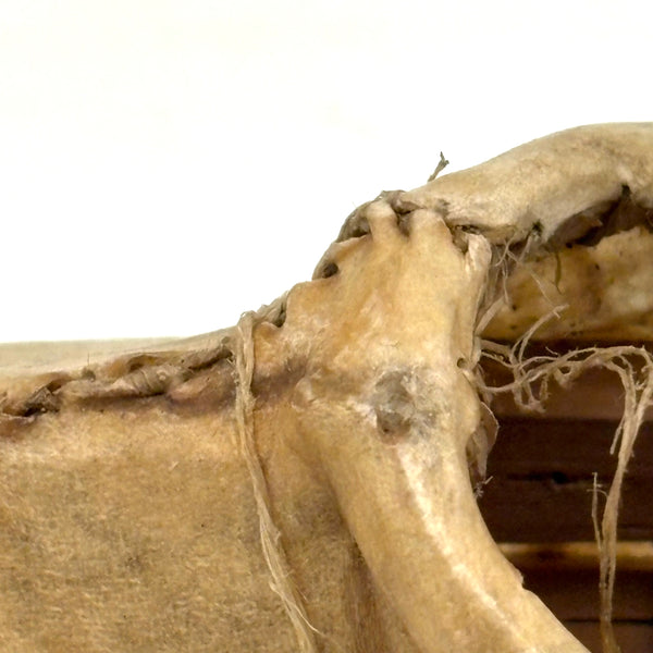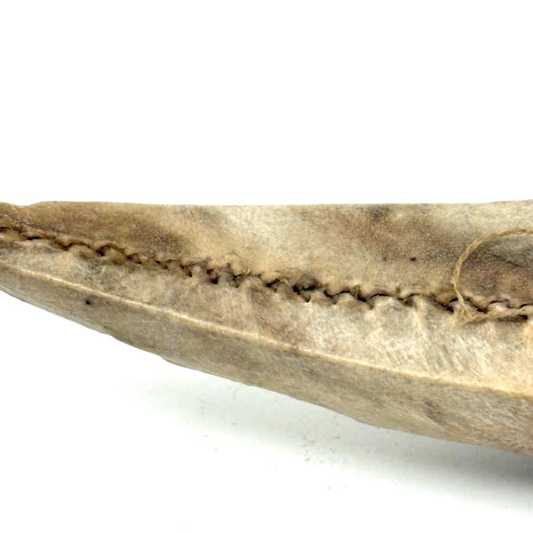 Yes, it is nice to find one of these with an old carved figure sitting inside it, but this kayak, hide tightly stretched over wooden frame and stitched with sinew (I love those seams) is quite a beautiful thing on its own. Inuit, likely Alaskan, and earlyish 20th century I believe. With one sinew thread stretched across the bow just in front of the seat which likely once secured a paddle.