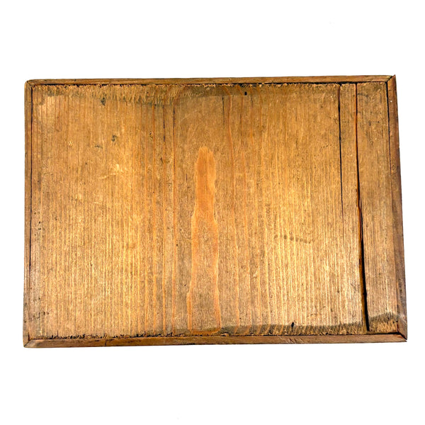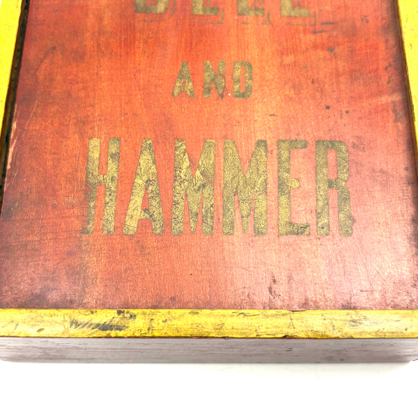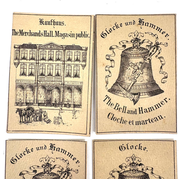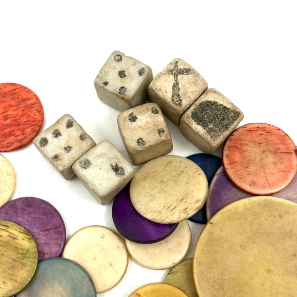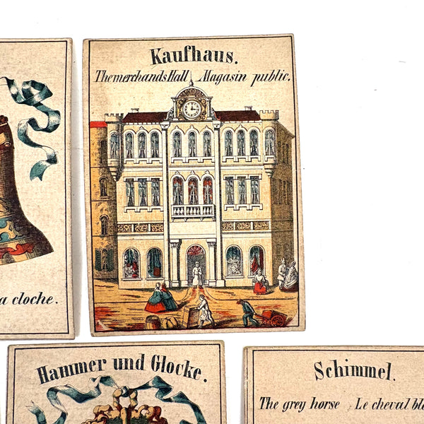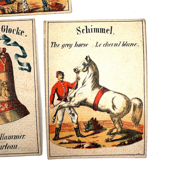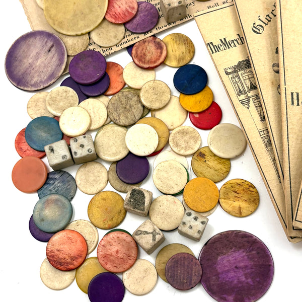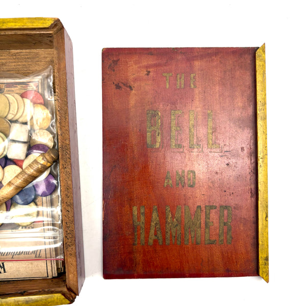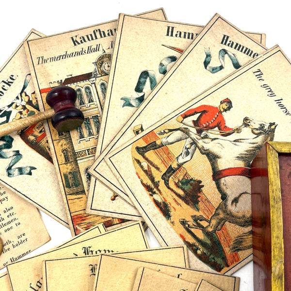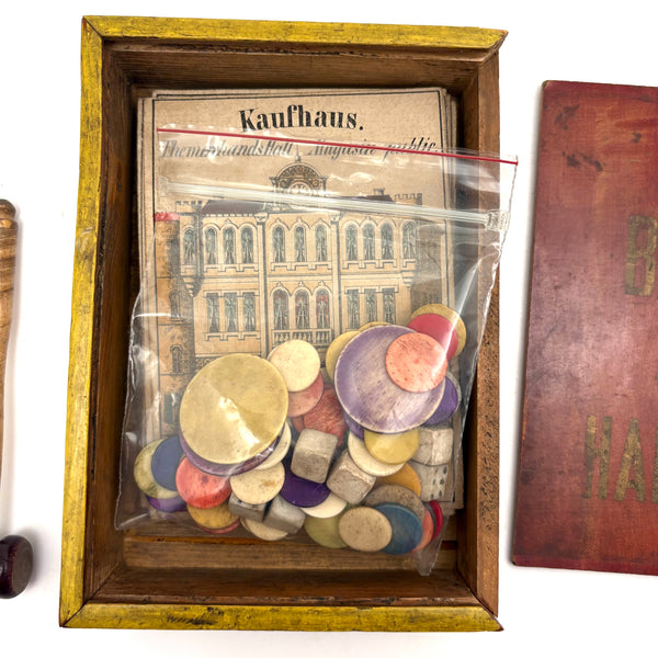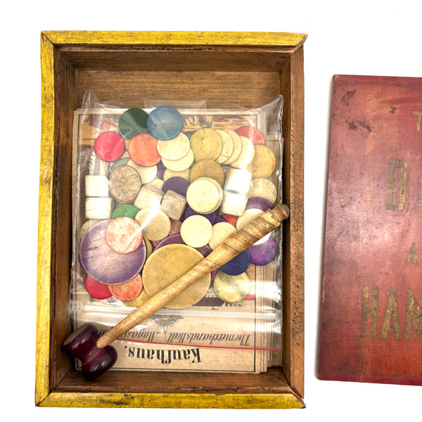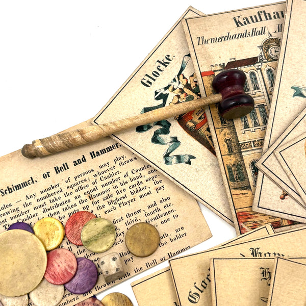 This is the second Bell and Hammer game (aka Whitehorse, and in German Glocke und Hammer or Schimmel) that I've found--and as with the first set I had, this one sold me on the box alone. (Such good all caps gold lettering on the slide lid of the box, making it feel to me as if top secret information about the Russians might be housed inside, and then that gorgeous yellow panted border.) This set, fourth quarter 19th century I would guess, includes six extra cards in addition to the complete set of 5 colored ones. Plus original instructions, wooden gavel, nice bunch of bone betting chips, and a near complete set of dice (six of them, each blank on all but one side, the marked sides featuring a bell on one, hammer on another, and dots on the rest marking 2, 4, 5 and 6; the 1 and 3 are missing. (Others could be substituted in order to play--I'd just take a couple of small regular dice and mark the 1 and 3 sides with a dab of paint, treating the other sides as blank, or one could go as far as to white out the other sides!)