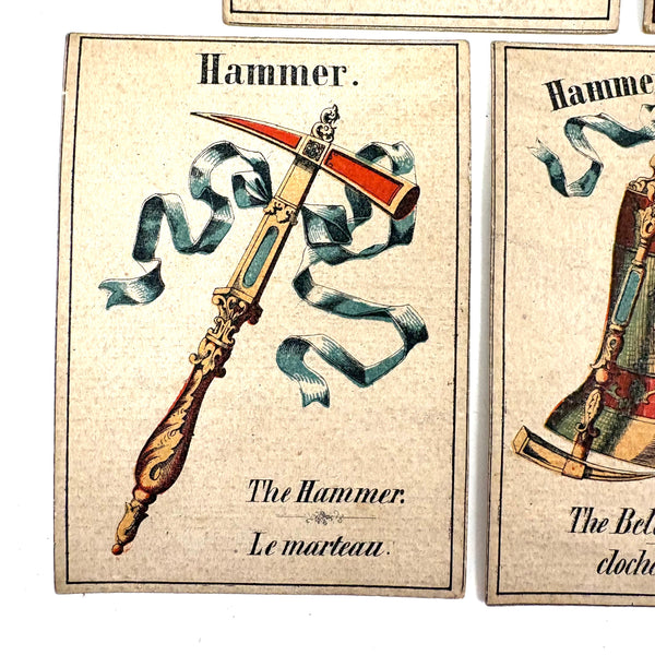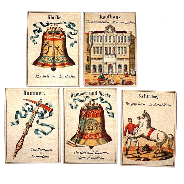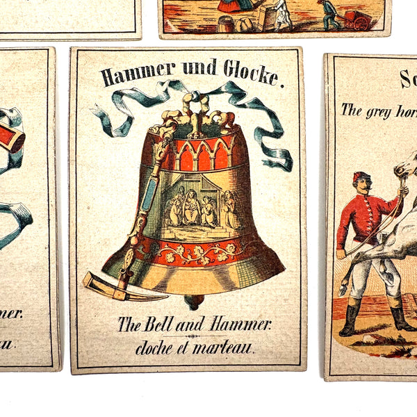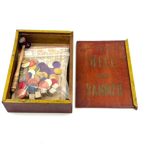 Bell and Hammer was popular in Europe into the early 20th century. It is a gambling game, with an initial throw of the dice determining the "auctioneer," who then auctions off the five different cards to the other players, who subsequently accumulate points/counters based on rolls of the dice in relation to the cards they own.