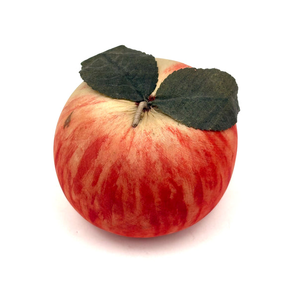 I've found one or two others like this antique hand-painted silk apple pin cushion over time, and will continue to snap them up whenever I do; what beautiful things! The streaks red and yellow color on the silk makes it just the most radiant thing. And this one with its two original green cloth leaves still in place, attached to the cloth wrapped wire stem. Completely lovely.