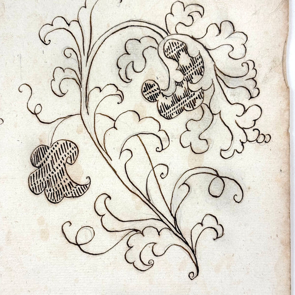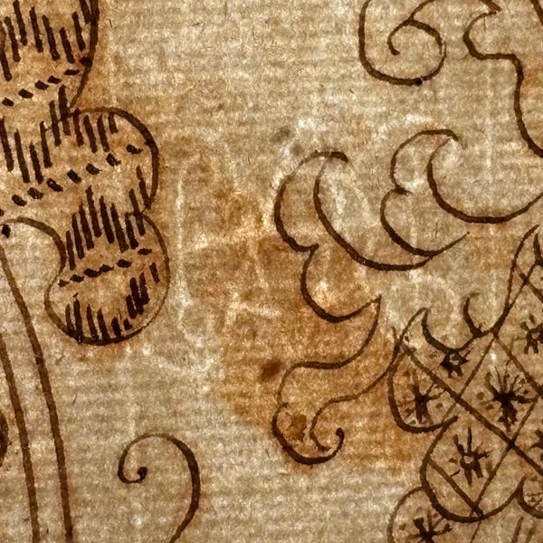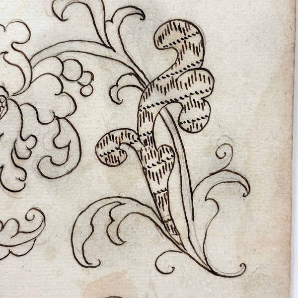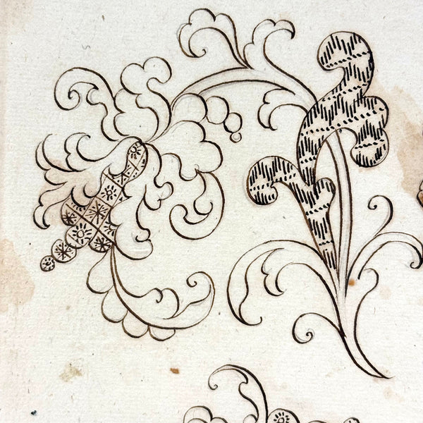 I believe this/these drawings were made as embroidery patterns--and I can very much imagine them executed in very fine silk thread. I love them rendered in ink though, on early watermarked laid paper, with wonderful passages of detail, tiny stars and crosshatching and squiggly lines with dots to either side. Lovely. Late 18th/very early 19th century European I believe, with watermark detailed in last photo, which I have not researched.