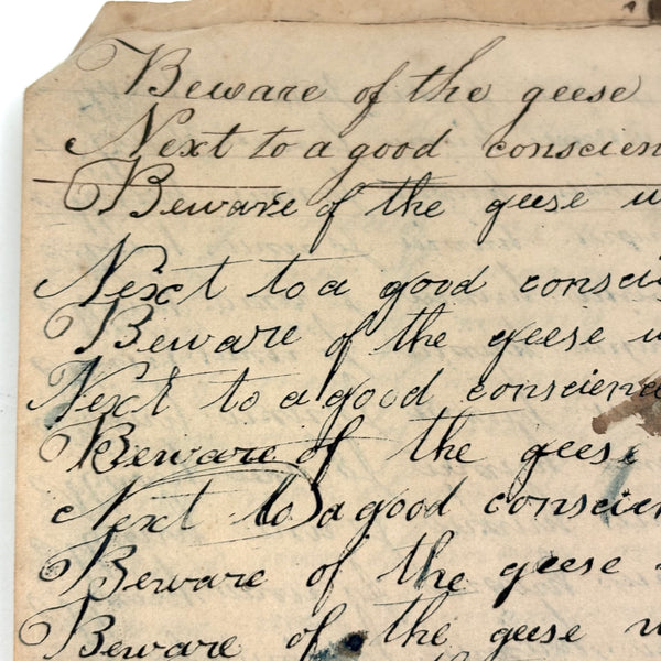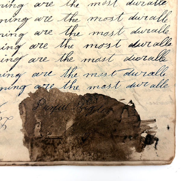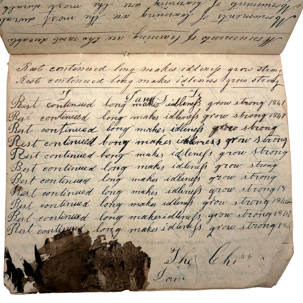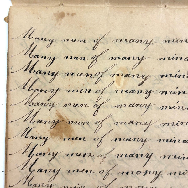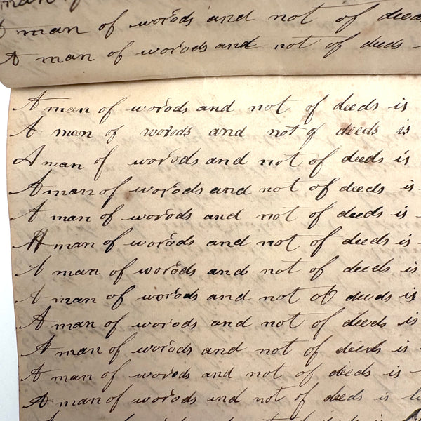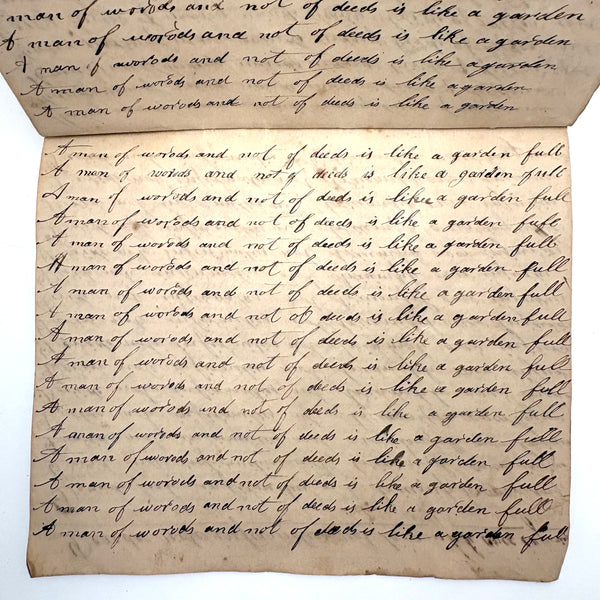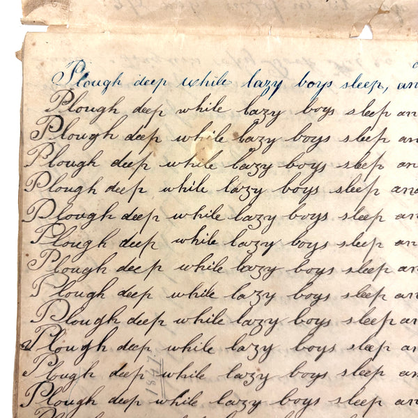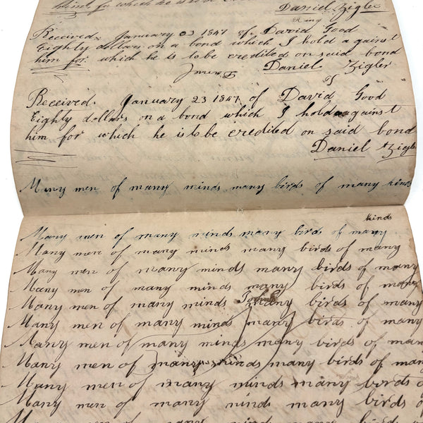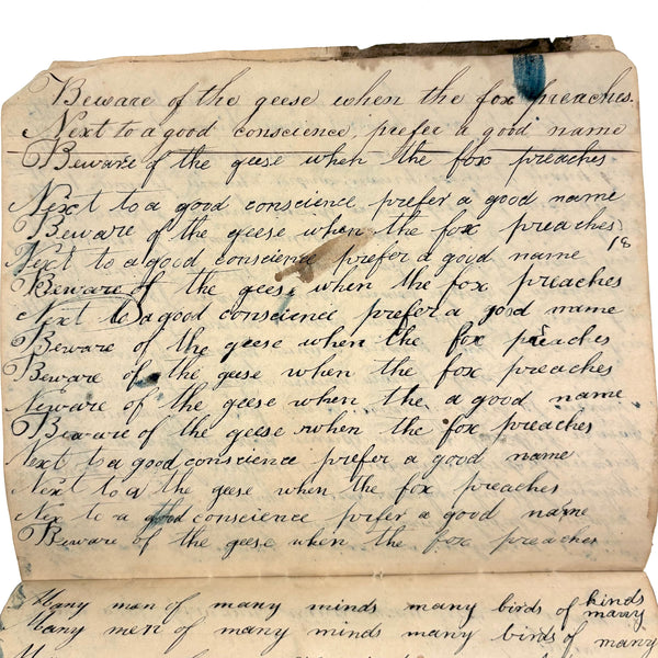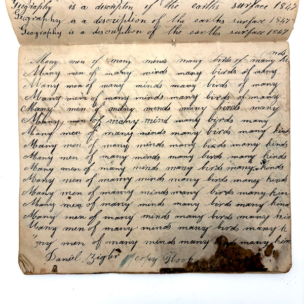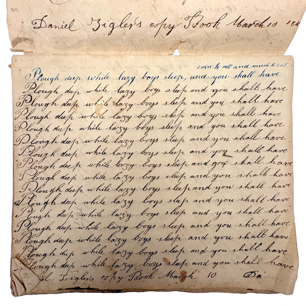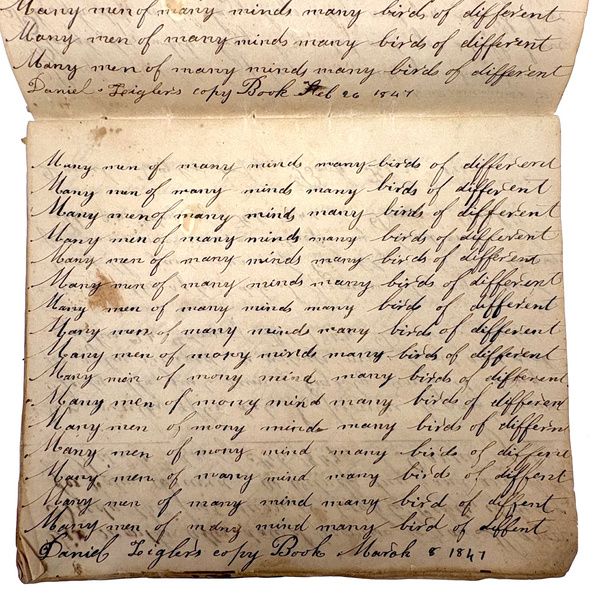 You know by now that early penmanship notebooks are one of my very favorite things, and having looked at many many at this point it takes special and unusual ones to excite me, which is the case with this one. The work of a Daniel Zigler, dated 1847, it features phrases I have not seen in one of these before, repeated many many times (not just one page's worth, but multiple pages of the same phrase.) And fun ones! "Many men of many minds, many birds of different kinds,"; God made man and man made money, God made bees, and bees made honey" (and with that "bees" often, in Daniel's hand, looking more like "beer"!); "A man of words and not of deeds is like a garden full of weeds"; "Plough deep while lazy boys sleep and you shall have corn to sell and much to eat"; "Rest continued long makes idleness grow strong"; "Beware of the geese when the fox preaches.," etc. Me thinks his teacher had a penchant for rhymes!