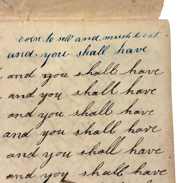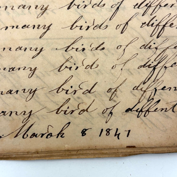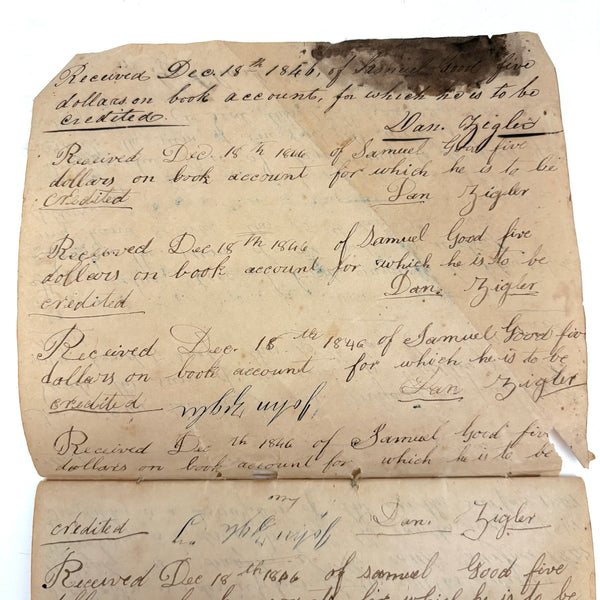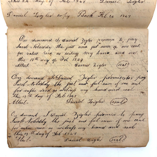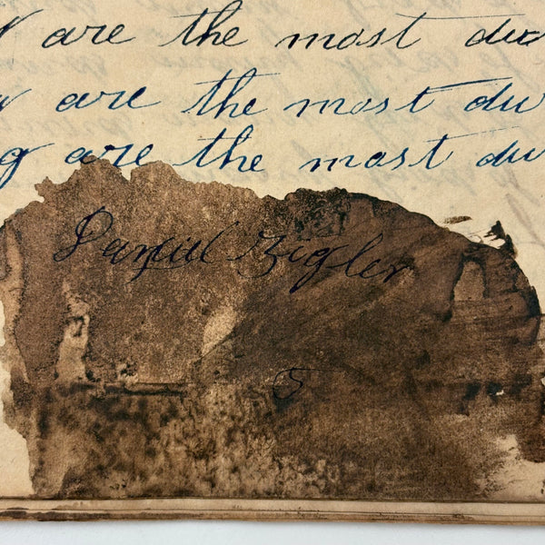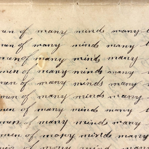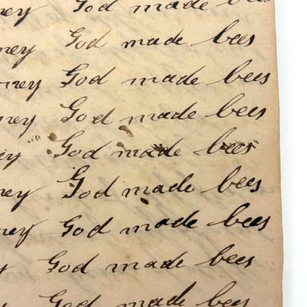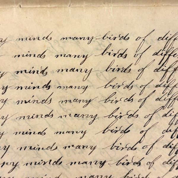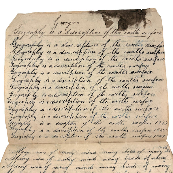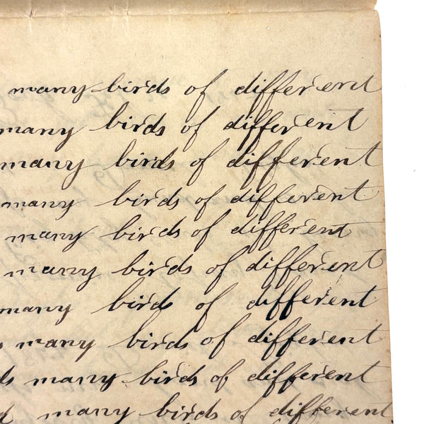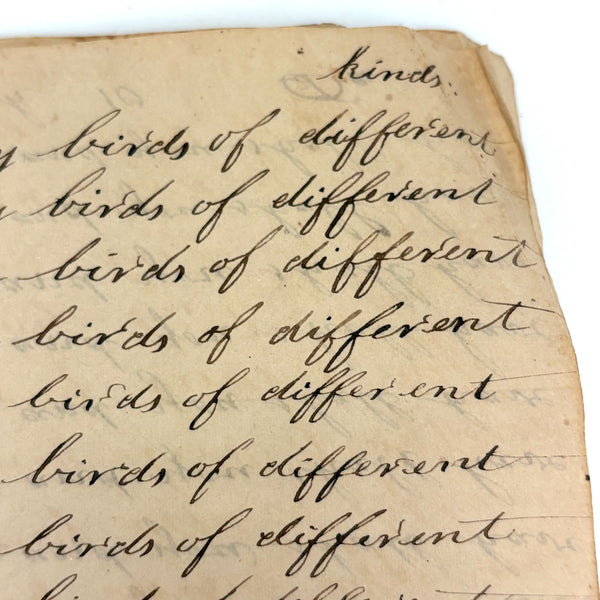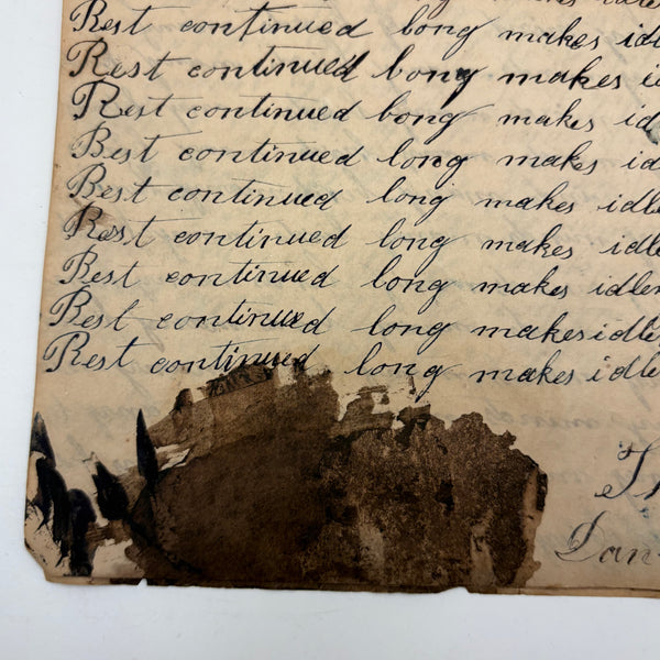 You know by now that early penmanship notebooks are one of my very favorite things, and having looked at many many at this point it takes special and unusual ones to excite me, which is the case with this one. The work of a Daniel Zigler, dated 1847, it features phrases I have not seen in one of these before, repeated many many times (not just one page's worth, but multiple pages of the same phrase.) And fun ones! "Many men of many minds, many birds of different kinds,"; God made man and man made money, God made bees, and bees made honey" (and with that "bees" often, in Daniel's hand, looking more like "beer"!); "A man of words and not of deeds is like a garden full of weeds"; "Plough deep while lazy boys sleep and you shall have corn to sell and much to eat"; "Rest continued long makes idleness grow strong"; "Beware of the geese when the fox preaches.," etc. Me thinks his teacher had a penchant for rhymes!