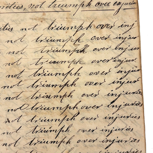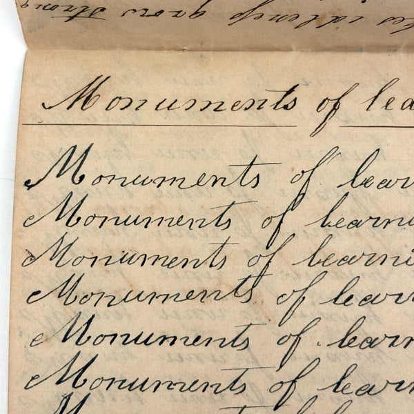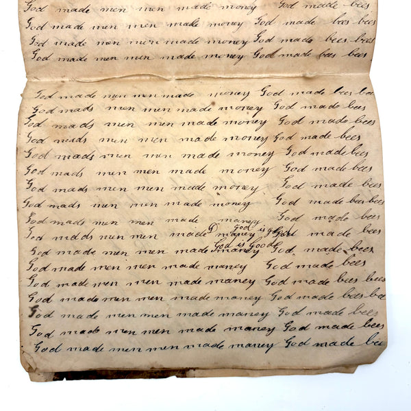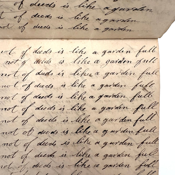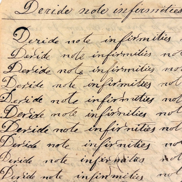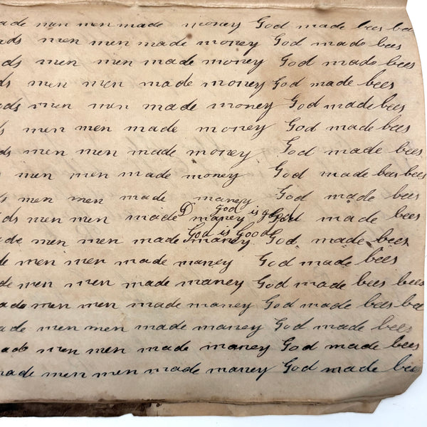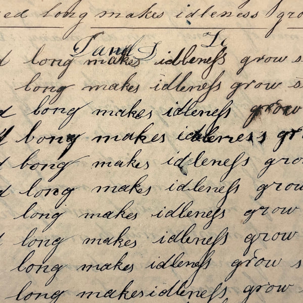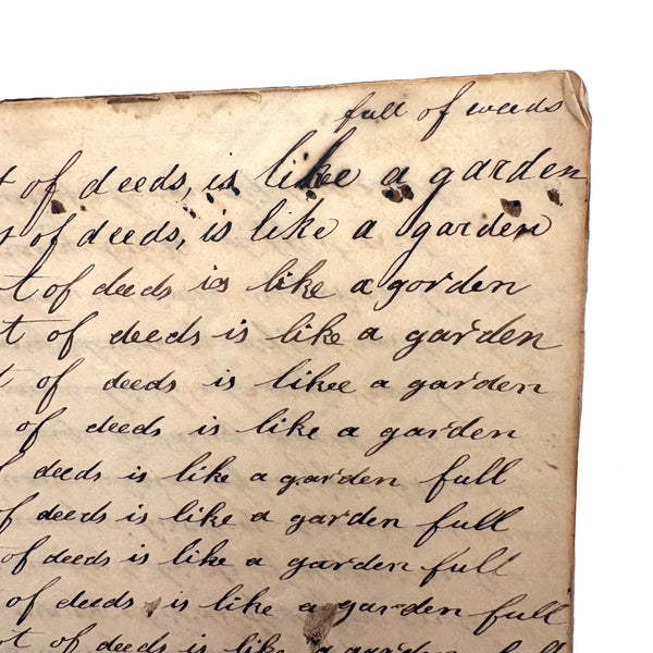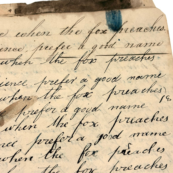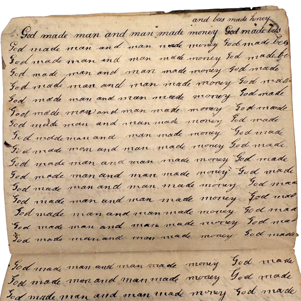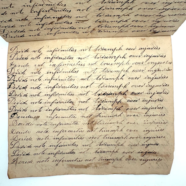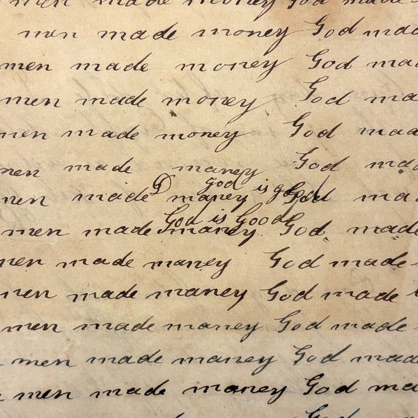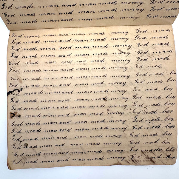 I can't find a location written on it (though Daniel signed and dated most pages) but I would guess (including for the many farming related references) it was a country school he was attending, with the "long s" still showing up (in idleness for example), after it had largely gone out of fashion, and the teacher, who would write the first line on the page as example, making a few mistakes of their own (as in deride note infirmities not triumph over injuries.) Anyway, sometimes I love these notebooks for the beauty of the handwriting, but even more so I love them as portraits of time and place and the person who kept them. And look closely, he's inserted the phrase "God is good" a few times amidst the endless field of "Man made money"s!
