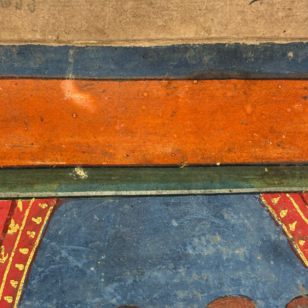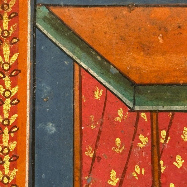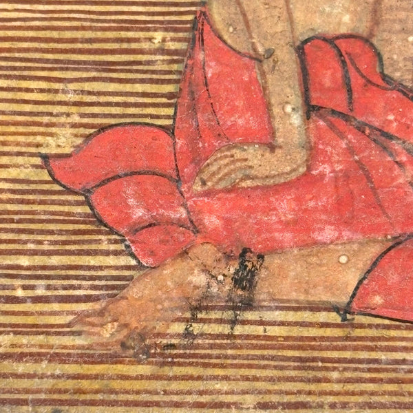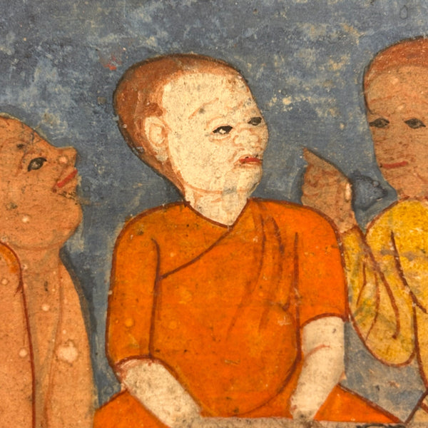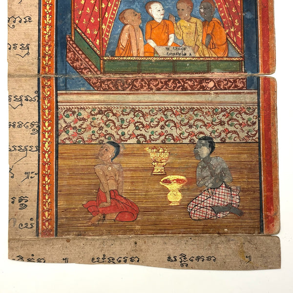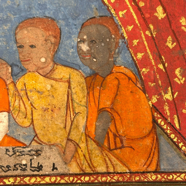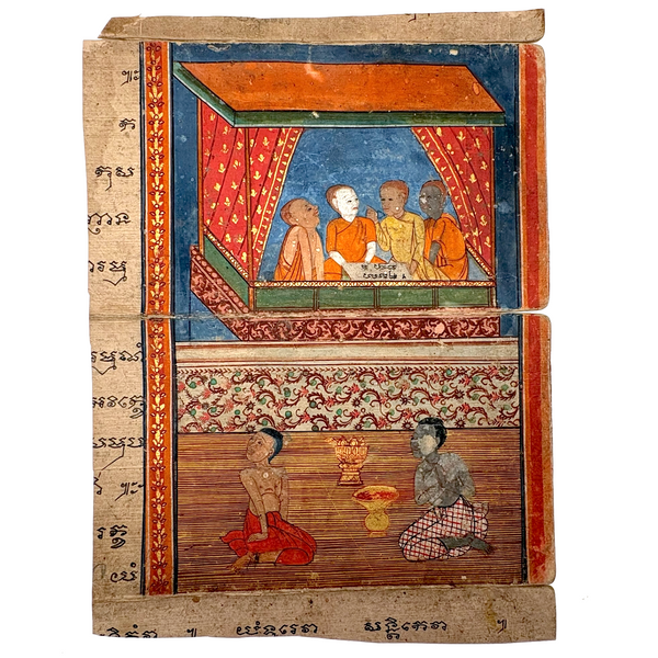This is a leaf, or maybe should be called two leaves, as it is hinged across the center, from a Thai manuscript folding book (samut khol), later 19th century I believe, gouache, ink and gold leaf on heavy (light board weight) paper.  I purchased it along with one other from the same manuscript, listed separately, and believe they may be illustrating episodes from the legend of Phra Mala, a core text of Theravada Buddhist teaching in Southeast Asia, especially in Thailand. In the story, Phra Malai, a Buddhist monk who accumulated so much merit that he acquired supernatural abilities, travels to the various  hells, where he meets suffering denizens and is implored to have their living relatives make merit on their behalf--and so, if indeed this painting tells an episode from that story, it feels like something of an apt compliment to the retablo with Anima Sola I also have listed today!) Anyway, considered independently (though forgive my first photo which is not very good; details do a better job), I find this very beautiful, for the lush richness of the color and decoration (that orange and the patterned pants of the man kneeling at lower right alone sold me on this), and for the faces and gestures and interactions, and for the spectrum of skin tones too. With a little more time I would dig deeper into this, but am pressed today, so will leave it to you, or me later!