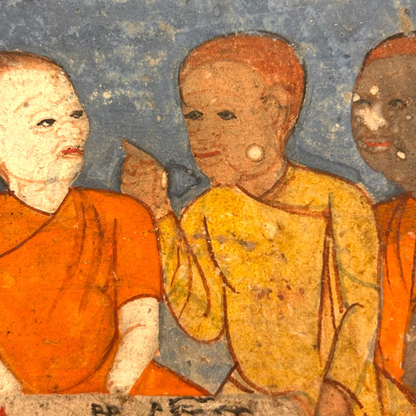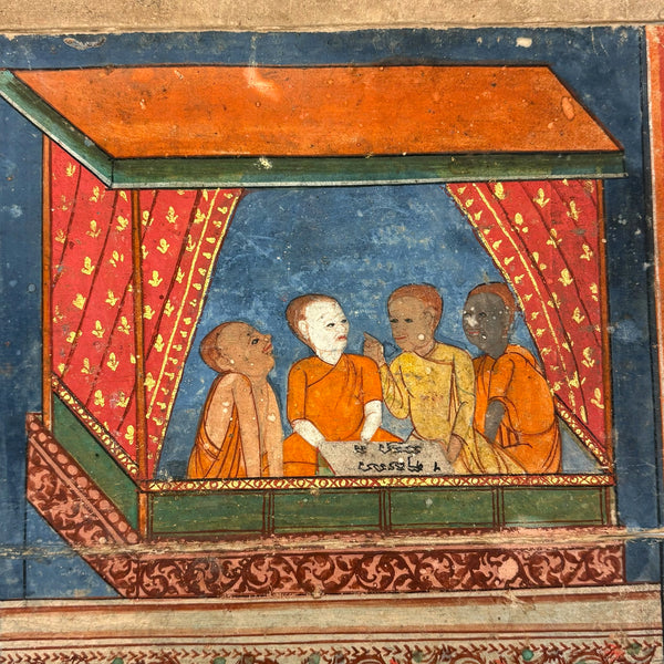Men of All Colors Talking and Praying, Gouache with Gold Leaf Antique Thai Manuscript Painting