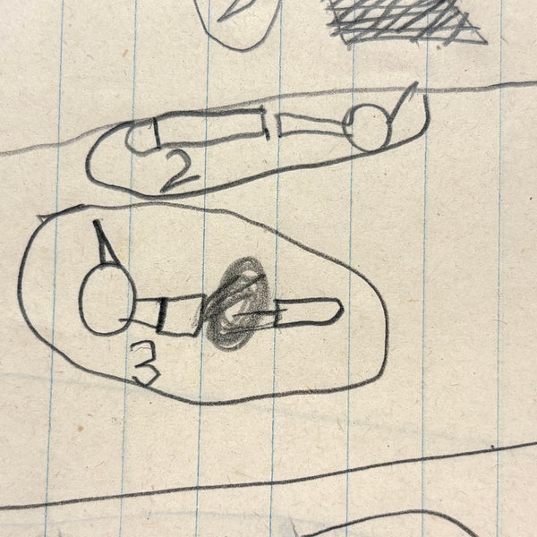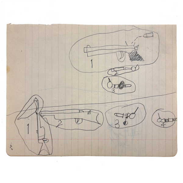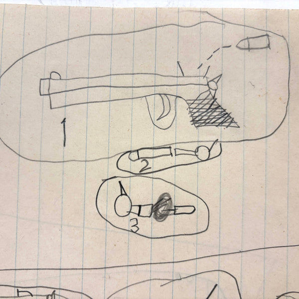 As is certainly abundantly clear, I have a deep love for drawings made by children, and an especially special love for drawings made by boys aged about 7 or 8, particularly action scenes playing out directly on the page--pure visceral expression of the imagination, so immediate. A few more today from a batch I purchased last summer, all by the same kid. This one more methodical than explosive, diagramming guns and bullets and I'm not sure what all else. I especially like the dotted line showing where/how to load the bullet in the top one. And with another one reverse of a master of the universe at his control station!
