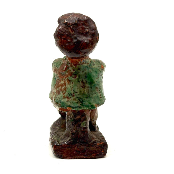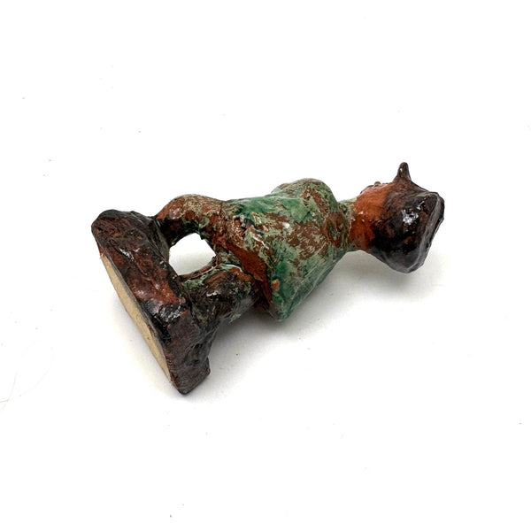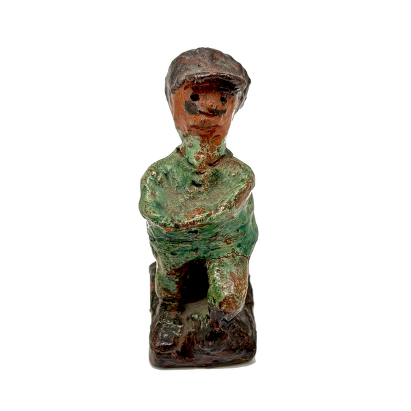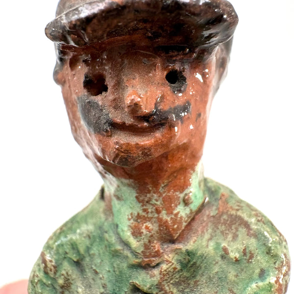 I've had this guy sitting around keeping me company for a while, but his green coat--and curious little face too, with a bit of leprechaun-esque mischeviousness to it--made think of St. Patricks day on the horizon, so I thought perhaps a good time to share him. (Also seems he could make a good talisman for cheering on the Celtics!) I purchased him from a great folk art dealer in Pennsylvania, and believe that is likely where he originated, in the long tradition of PA redware folk art sculpture. The form of his hat, especially, makes me think maybe meant to represent a train conductor--and certainly he looks as is waiting around, cross armed, for the train to arrive--or perhaps for the passengers to get on board already so the train can depart! And he's very good all the way around, his face especially revealing different aspects of character from every point of view.