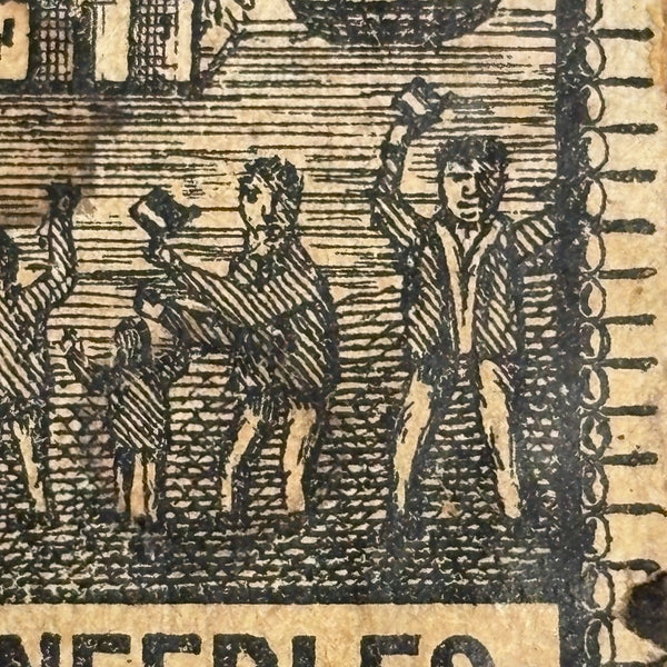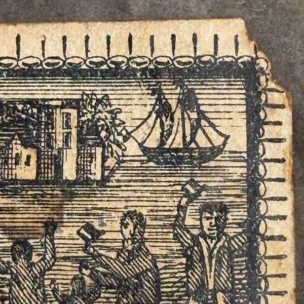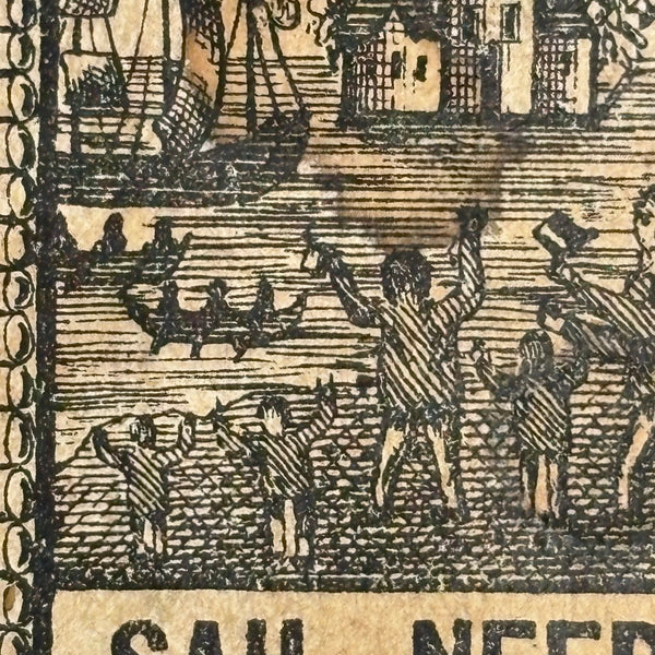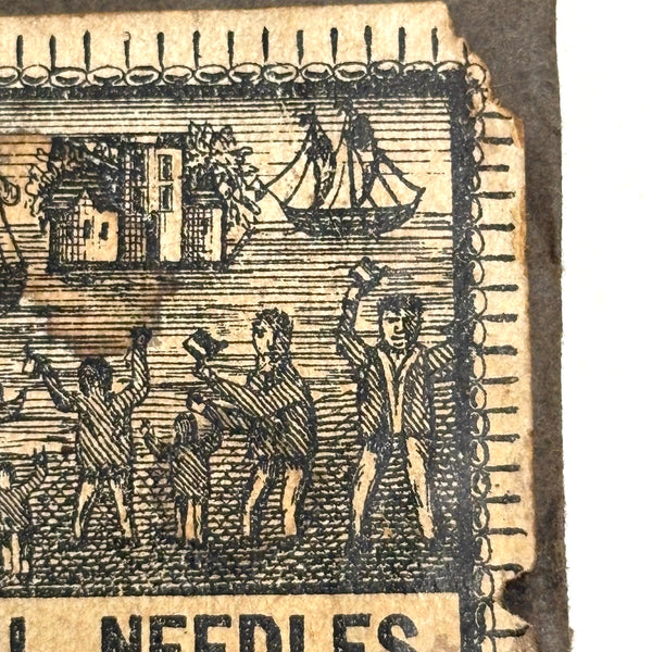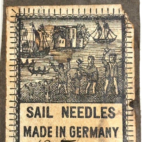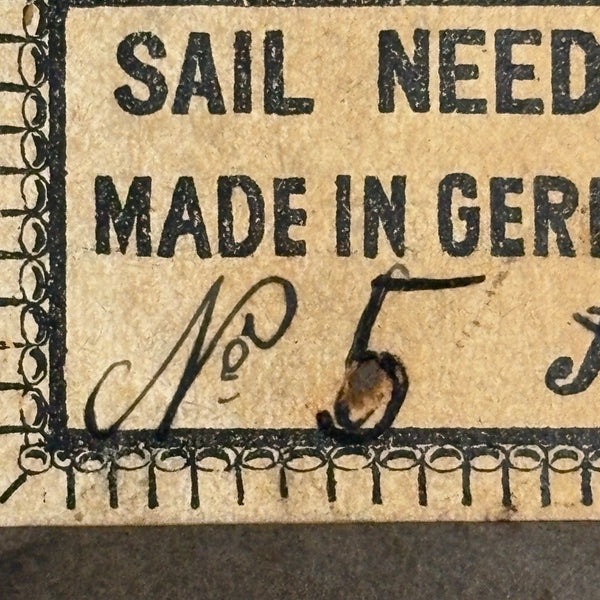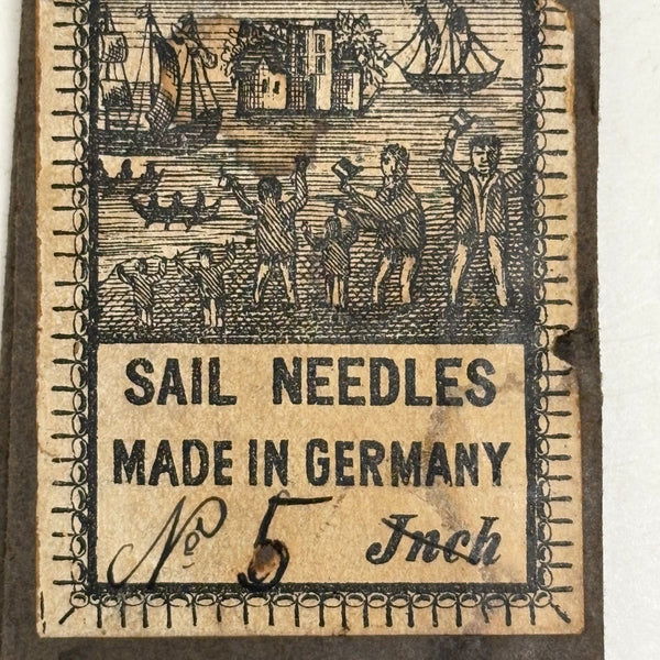 At the Boston Antiquarian Book Fair last week, I spotted some early sail needles very similar to this set in a vitrine (being sold alongside some other 19th c. nautical materials for a massive sum.) So when I came across these the next day at a show in Maine, I snatched them, mostly because I found the engraving on the label quite wonderful, and that hand-inked "No.5," too, but also as impetus to learn a bit about sail needles--made, as self evident, for hand-stitching sails. Most all that I've found from the 19th century are British, but these are German, and I can find no others out there with this paper label. I believe these are earlier 19th c. than later, and I think this a really wonderful example of an early paper label: look at the faces of those men facing us, holding their hats, as if we were just about to crash into them!
